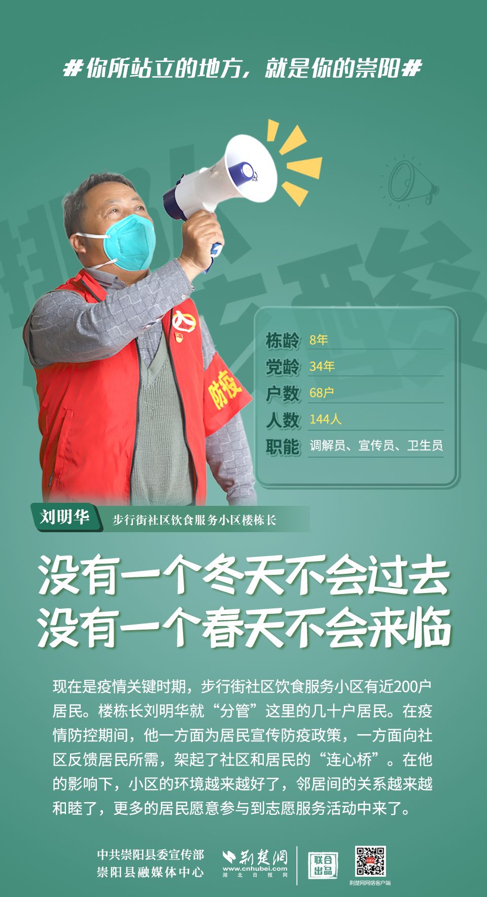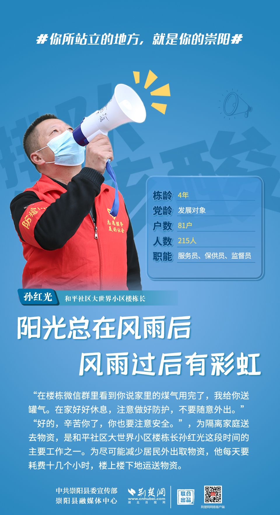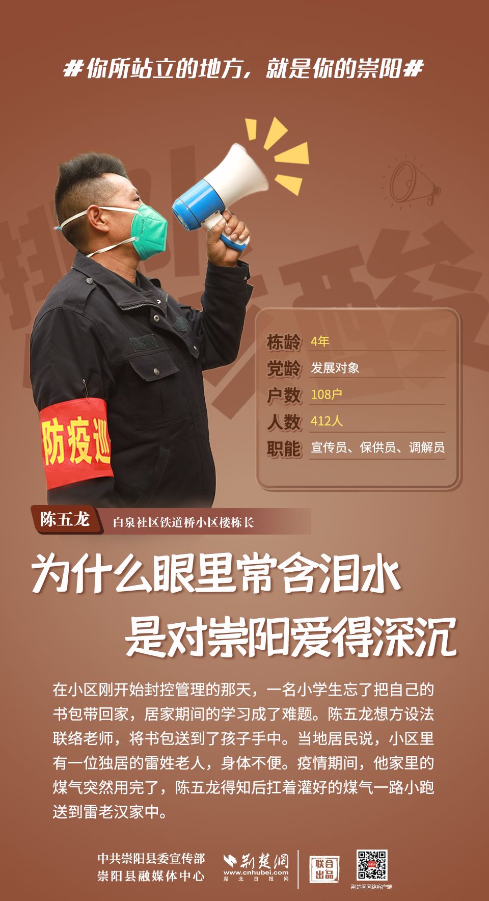 崇陽疫情正處于吃勁關(guān)口,你所站立的地方就是你的崇陽;你怎么樣,崇陽便怎么樣;你是什么,崇陽便是什么;你積極,崇陽就不消極;你熱情,崇陽就不冷淡;你有光明,崇陽便不再黑暗。疫情面前,沒有“看客”,更沒有“局外人”,致敬每一位宅家抗疫的你!
