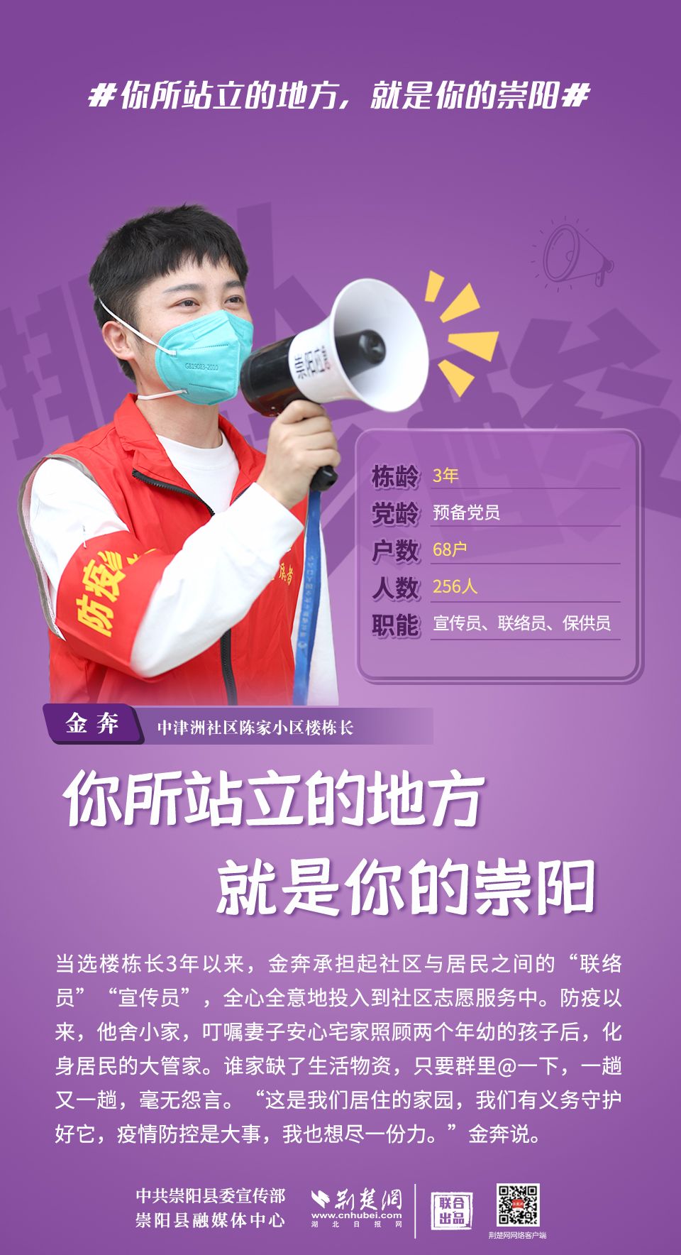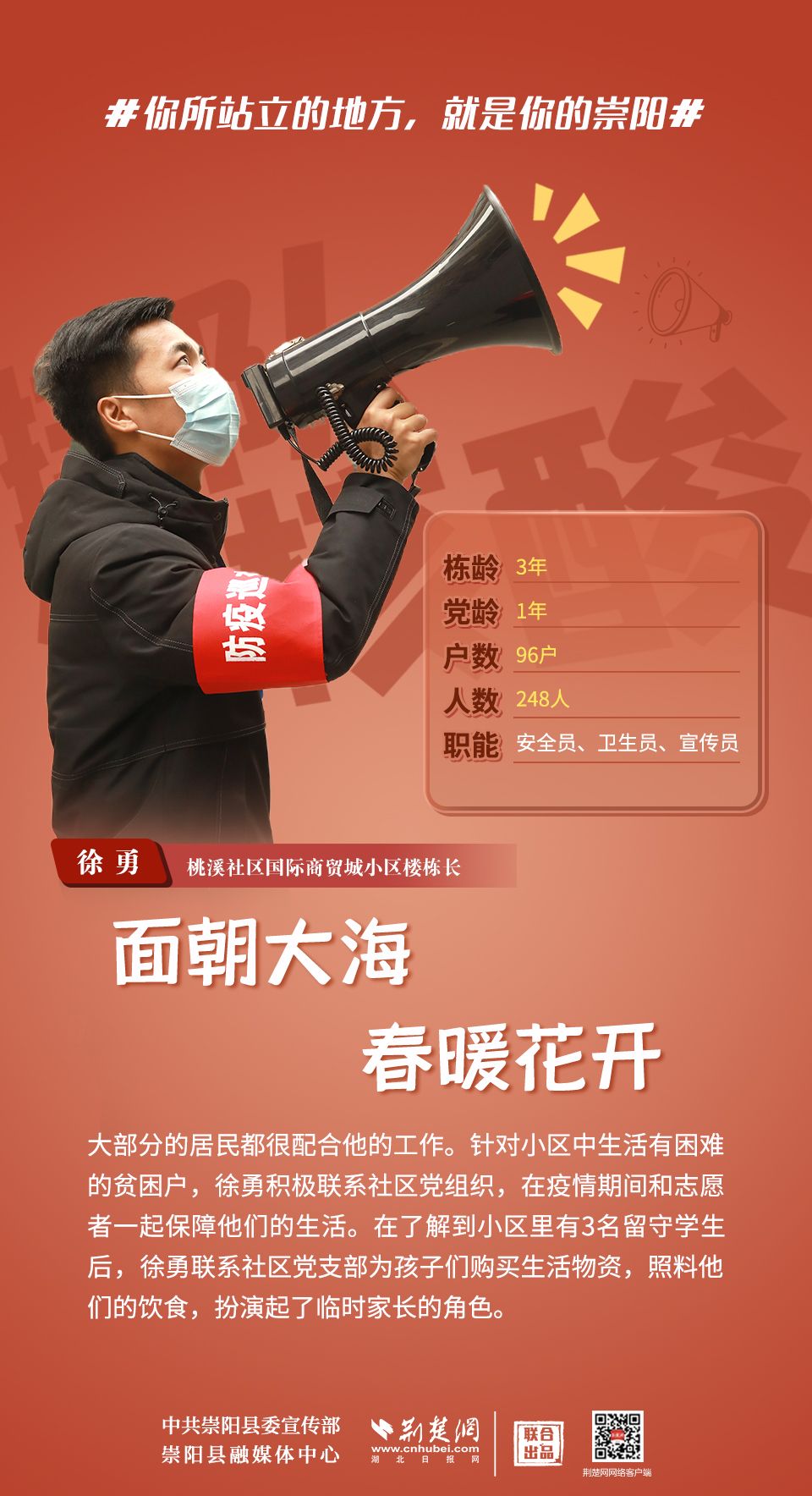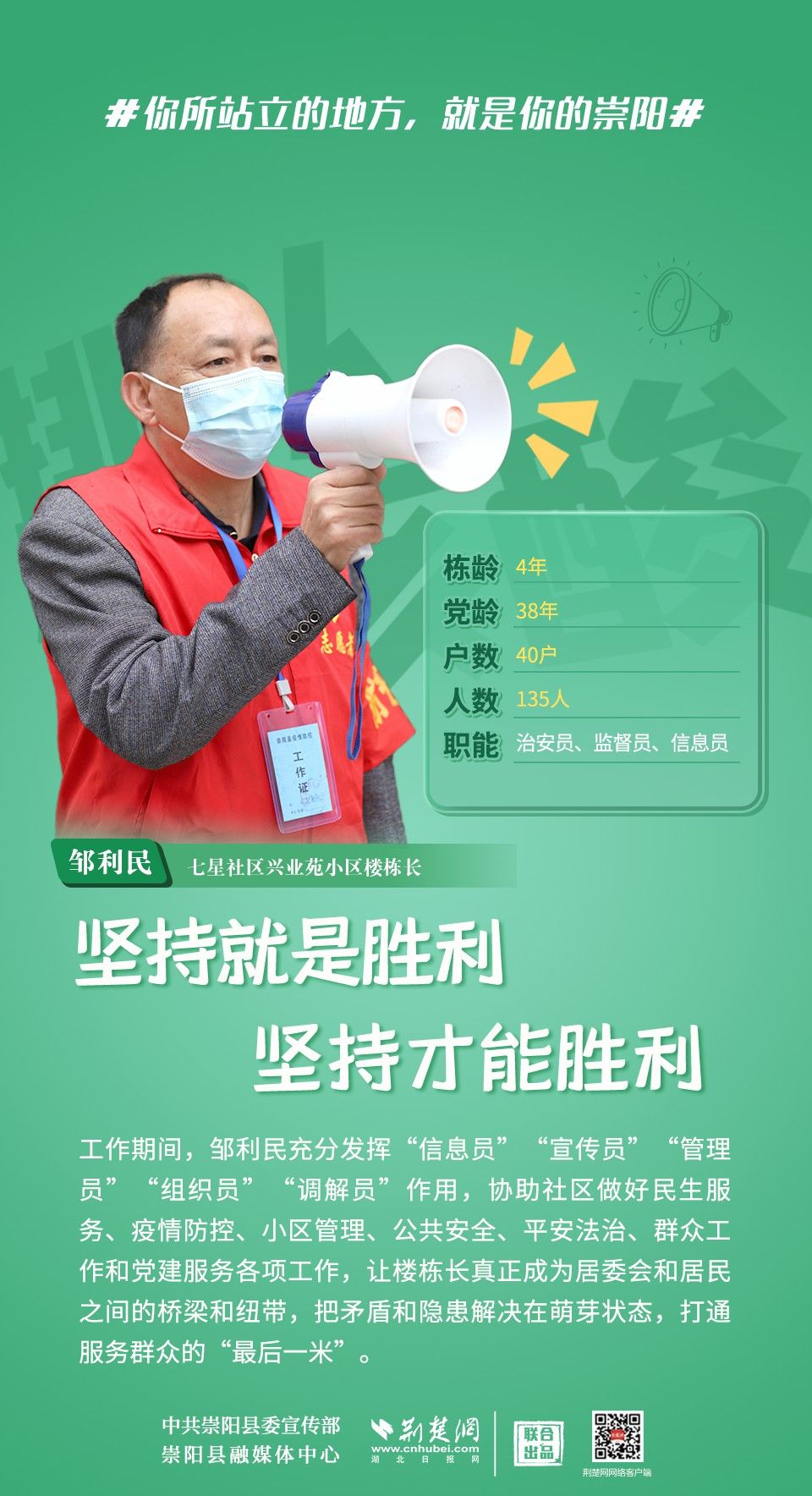 崇陽疫情正處于吃勁關(guān)口,你所站立的地方就是你的崇陽;你怎么樣,崇陽便怎么樣;你是什么,崇陽便是什么;你積極,崇陽就不消極;你熱情,崇陽就不冷淡;你有光明,崇陽便不再黑暗。疫情面前,沒有“看客”,更沒有“局外人”,致敬每一位宅家抗疫的你!