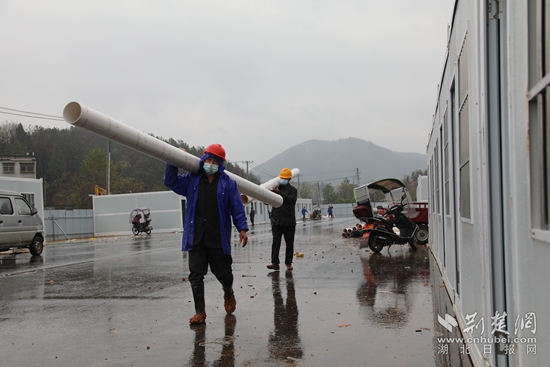 “雨又來了,管道這邊加人、加料,大家加把勁,今天必須完成所有排污管道的鋪設(shè)?!?1月29日上午6時,崇陽縣赤通公路旁備用集中隔離點項目建設(shè)現(xiàn)場,跟雨點一樣急的是項目A區(qū)負責(zé)人劉華豪沙啞的嘶吼。