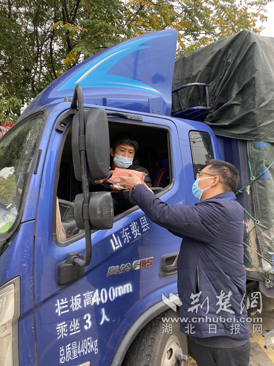 在博洛尼家居用品(湖北)有限公司門口,來自廣東佛山的貨車司機(jī)王師傅收到高新區(qū)黨群工作部疫情防控工作人員送上的“暖心包”,笑著豎起大拇指。