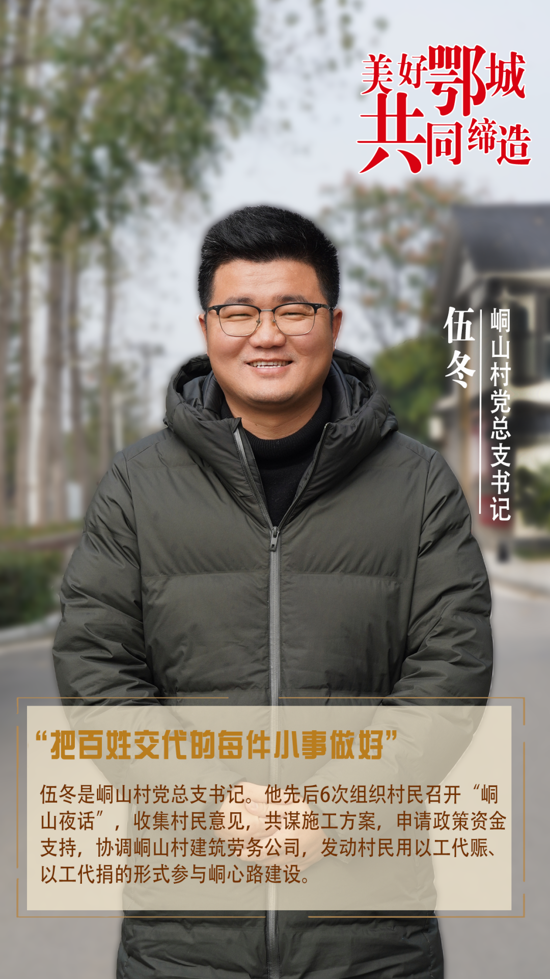 伍冬是峒山村黨總支書記。他先后6次組織村民召開“峒山夜話”,收集村民意見,共謀施工方案,申請(qǐng)政策資金支持,協(xié)調(diào)峒山村建筑勞務(wù)公司,發(fā)動(dòng)村民用以工代賑、以工代捐的形式參與峒心路建設(shè)。
