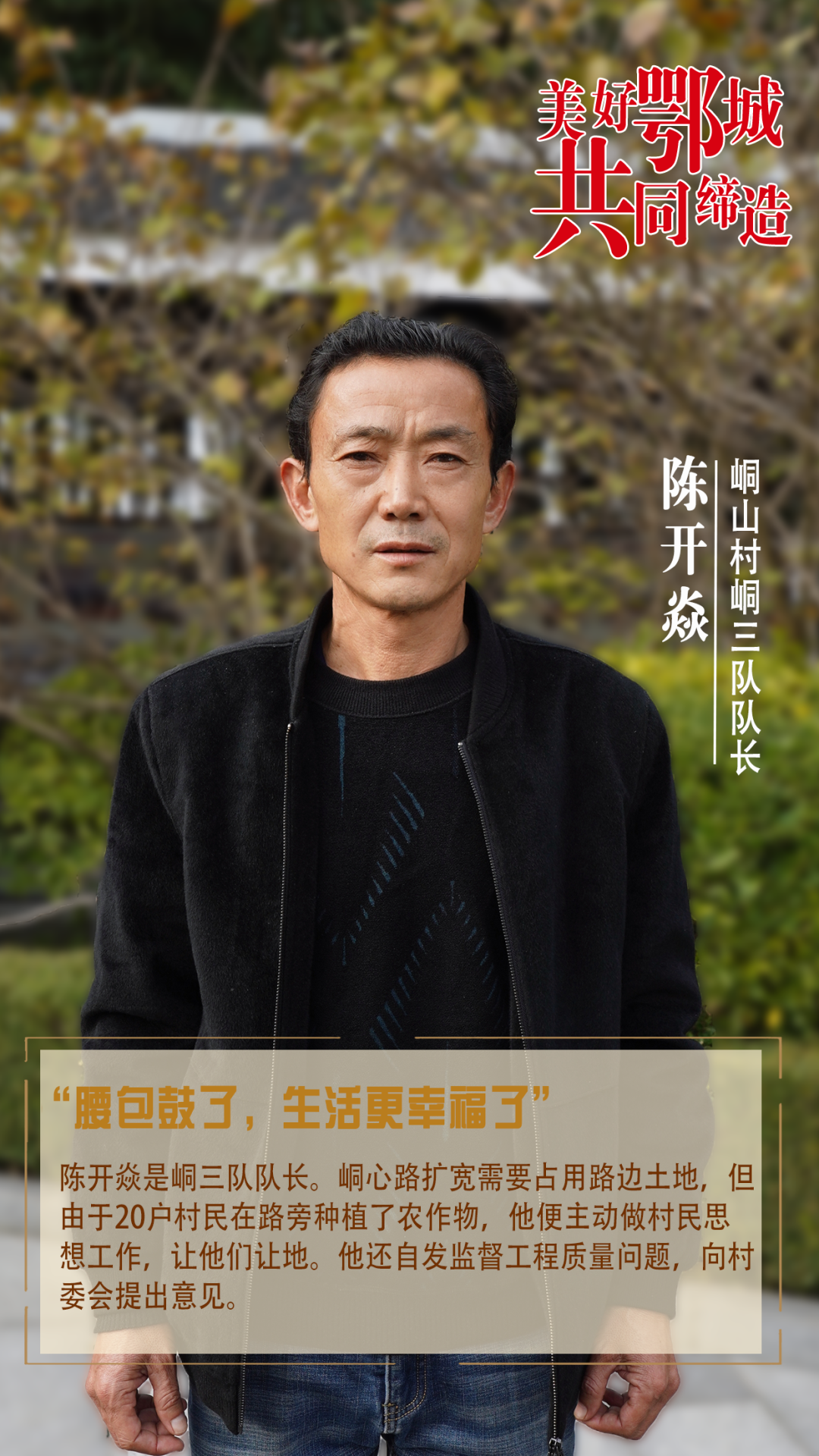 陳開焱是峒三隊(duì)隊(duì)長。峒心路擴(kuò)寬需要占用路邊土地,但由于20戶村民在路旁種植了農(nóng)作物,他便主動(dòng)做村民思想工作,讓他們讓地。他還自發(fā)監(jiān)督工程質(zhì)量問題,向村委會(huì)提出意見。