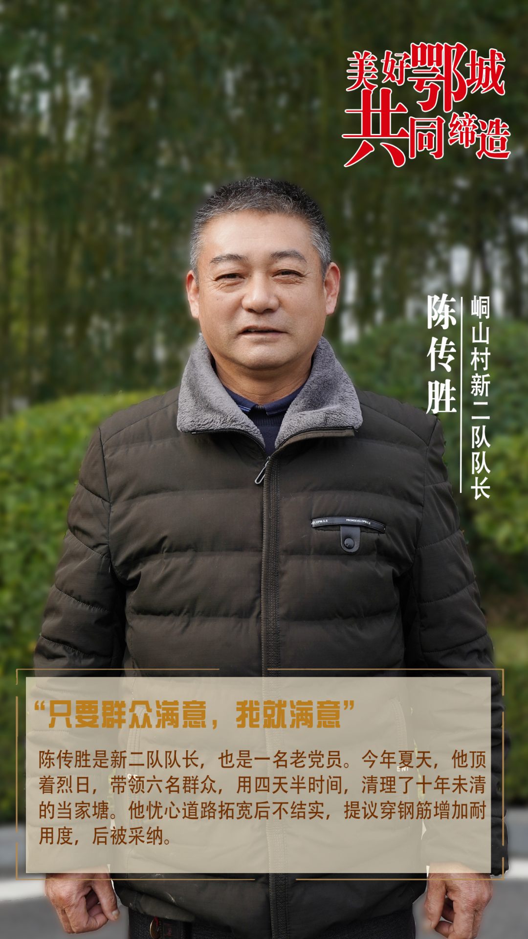 陳傳勝是新二隊(duì)隊(duì)長,也是一名老黨員。今年夏天,他頂著烈日,帶領(lǐng)六名群眾,用四天半時(shí)間,清理了十年未清的當(dāng)家塘。他憂心道路拓寬后不結(jié)實(shí),提議穿鋼筋增加耐用度,后被采納。
