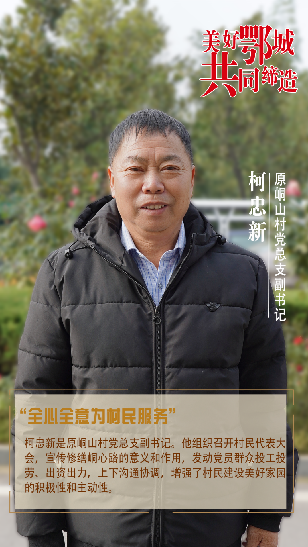 柯忠新是原峒山村黨總支副書記。他組織召開村民代表大會(huì),宣傳修繕峒心路的意義和作用,發(fā)動(dòng)黨員群眾投工投勞、出資出力,上下溝通協(xié)調(diào),增強(qiáng)了村民建設(shè)美好家園的積極性和主動(dòng)性。