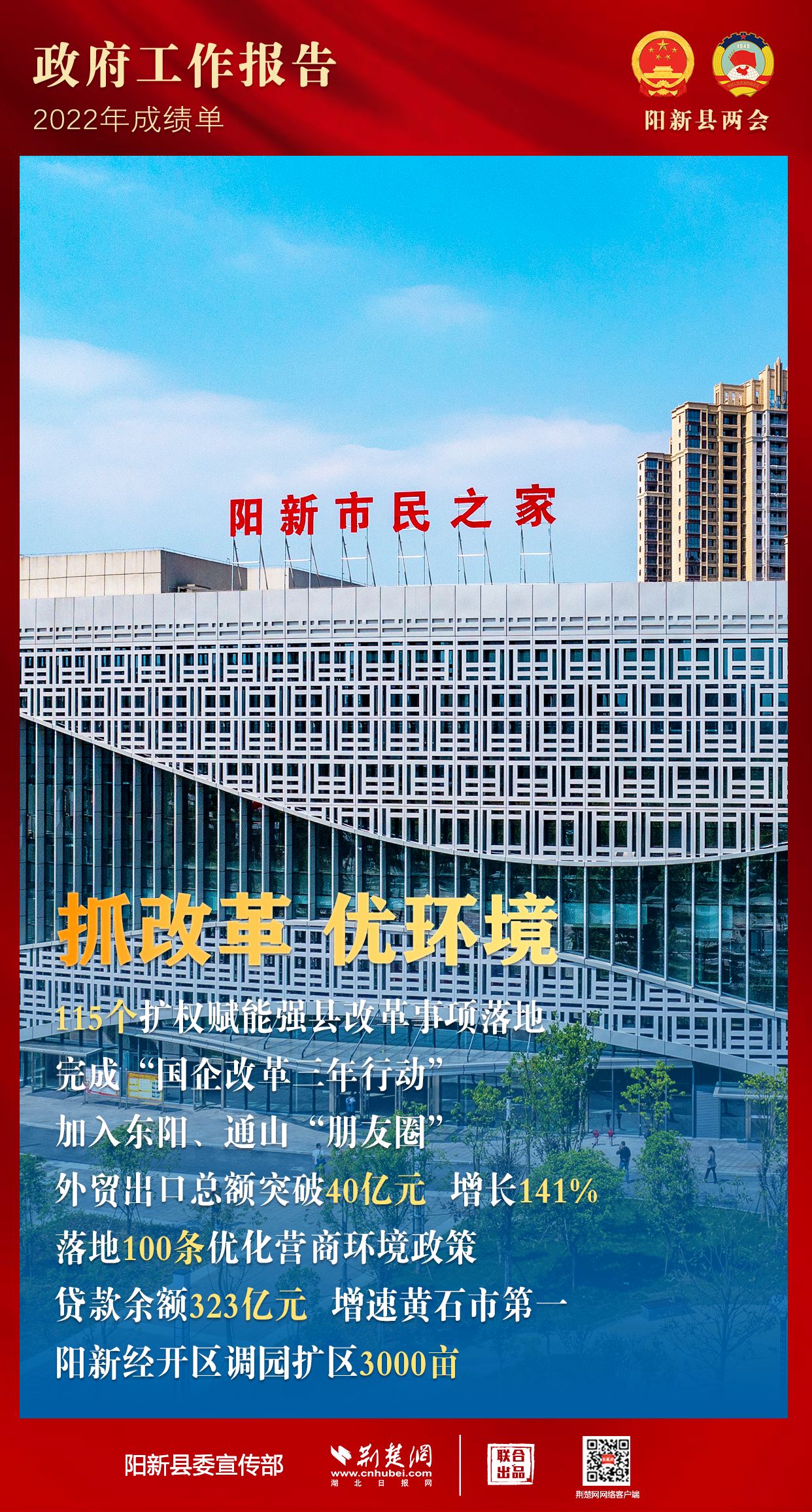 1月10日上午,在陽(yáng)新縣第十九屆人民代表大會(huì)第三次會(huì)議上,陽(yáng)新縣長(zhǎng)楊波代表陽(yáng)新縣人民政府向大會(huì)作政府工作報(bào)告。楊波回顧了2022年陽(yáng)新縣工作,并從八個(gè)方面對(duì)2023年工作進(jìn)行了部署安排。