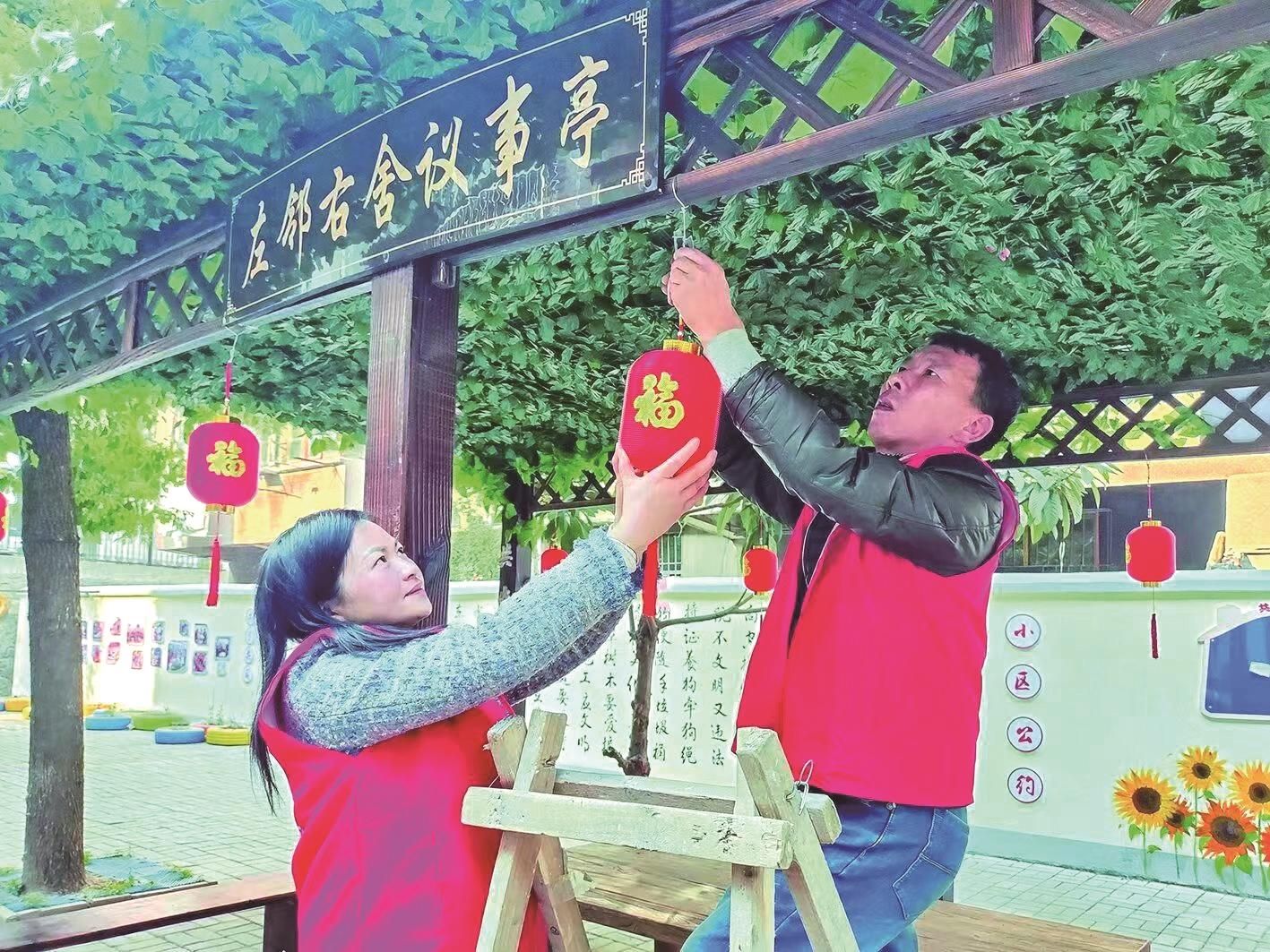 鐵山街道新村社區(qū)新時(shí)代文明實(shí)踐站組織志愿者在轄區(qū)掛燈籠迎新年。