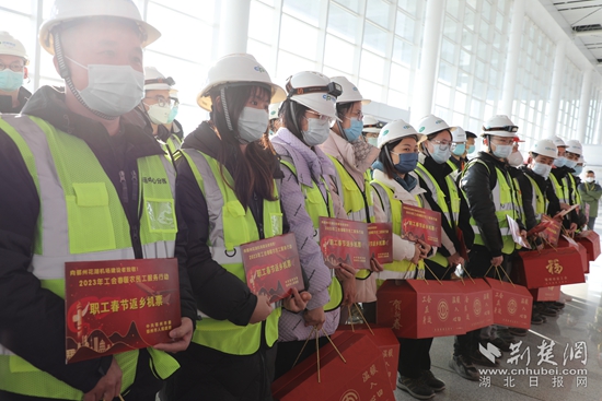 在鄂州花湖機場航站樓一樓大廳,現(xiàn)場氣氛熱烈,上午9時,鄂州市總工會為乘機返鄉(xiāng)的首批60名建設者代表贈送飛機票和年貨禮包,讓春節(jié)回家路更加溫暖、舒心、便捷。