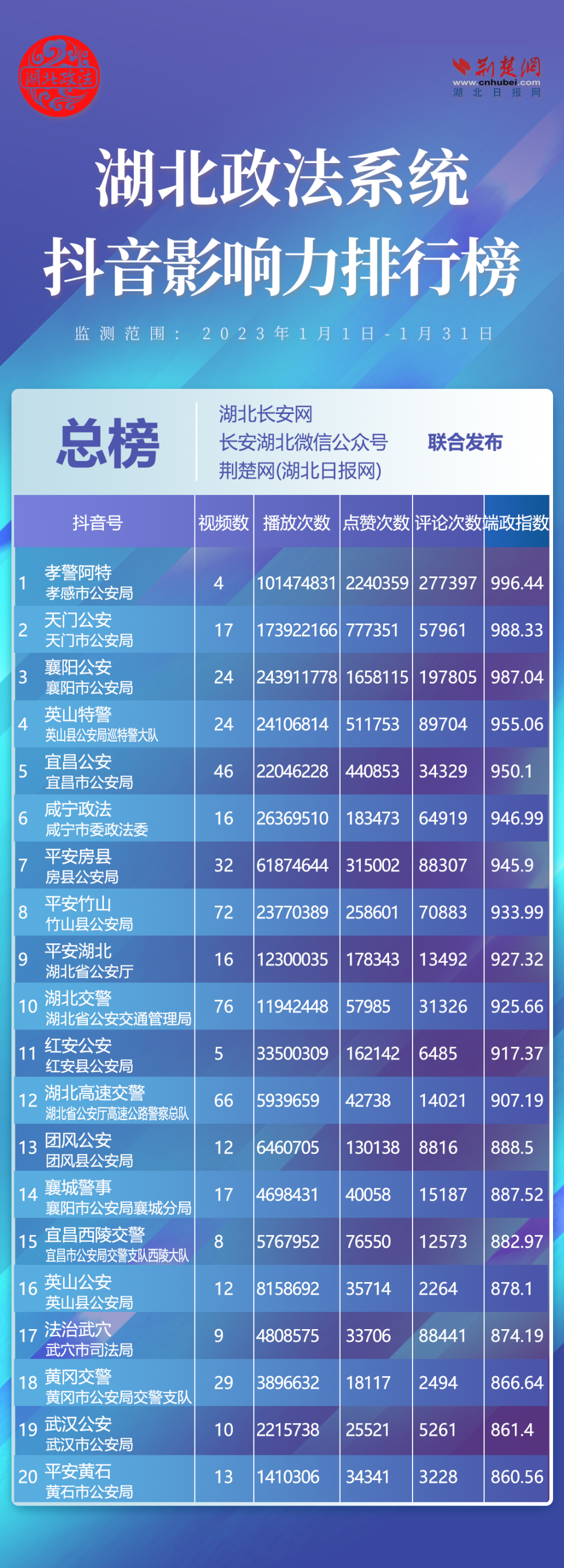 湖北政法系統(tǒng)370個(gè)抖音帳號(hào)參加評(píng)選,其中政法委系統(tǒng)82個(gè)、法院系統(tǒng)52個(gè)、檢察系統(tǒng)8個(gè)、公安系統(tǒng)195個(gè)、司法系統(tǒng)33個(gè)?!坝⑸教鼐?、“紅安公安”、“團(tuán)風(fēng)公安”、“英山公安”、“法治武穴”、“黃岡交警”6家單位強(qiáng)勢(shì)上榜,分別排名第4位、11位、13位、16位、17位、18位。