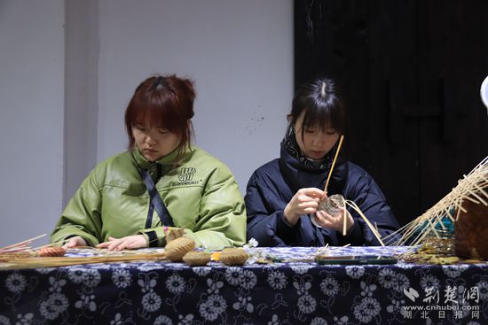 在演出現(xiàn)場(chǎng)旁的鄉(xiāng)村記憶館內(nèi),馬橋油畫風(fēng)景寫生展、鄂南雕花剪紙作品展同時(shí)吸引著游人的目光。來自湖北科技學(xué)院的學(xué)生正在展廳中編織特色竹制品,繪制富有當(dāng)?shù)孛袼滋攸c(diǎn)的文創(chuàng)作品。