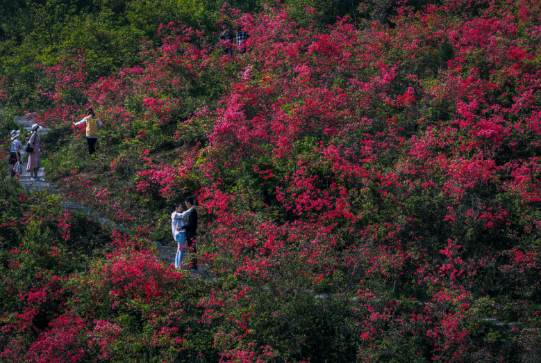 “山青花欲燃,觸目皆是花”,武漢木蘭云霧山的杜鵑花已進(jìn)入盛花期。遠(yuǎn)遠(yuǎn)望去,1萬多畝野生杜鵑花,似錦似霞,如一幅緩緩展開的畫卷,從腳下涌向天邊,花海延綿到山峰。