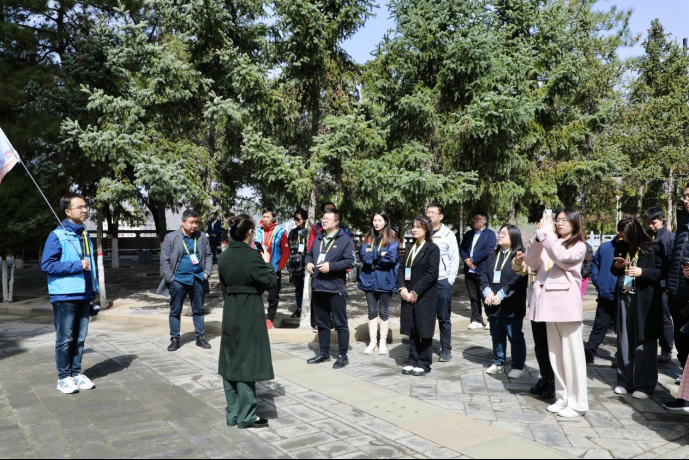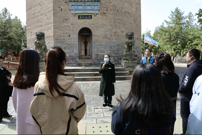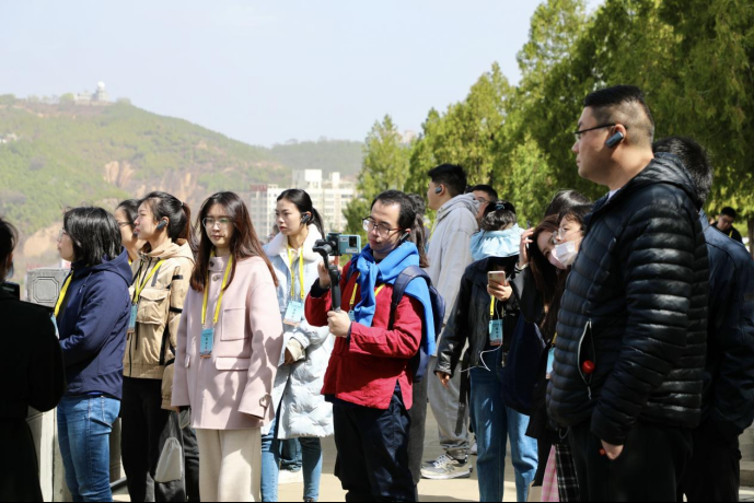 媒體團(tuán)記者聽講解員介紹寶塔山。