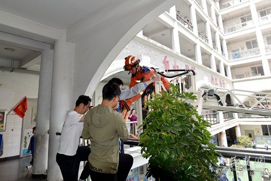 “火災(zāi)”發(fā)生后,學(xué)校立即啟動(dòng)應(yīng)急疏散預(yù)案:由老師組織學(xué)生有序疏散、安保人員進(jìn)行初期火災(zāi)撲救,同時(shí)撥打119電話報(bào)警。消防人員到場后迅速開展滅火救援,并利用云梯消防車成功解救兩名行動(dòng)不便的被困高樓層的學(xué)生。