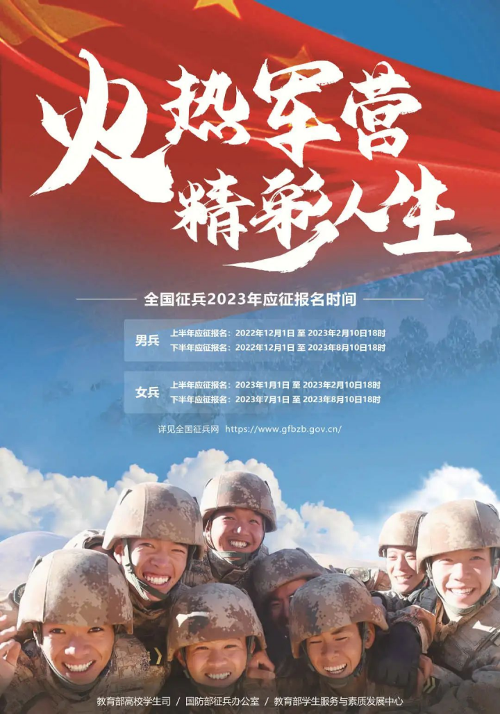 2023年下半年男兵應(yīng)征報名已經(jīng)開始,報名時間截至2023年8月10日18時。有志青年們,青春由磨礪而出彩,人生因奮斗而升華,火熱軍營期待你們的加入!