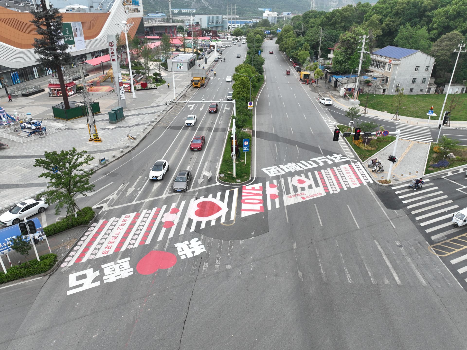28日上午,在多個視頻平臺里,出現(xiàn)了一條黃石“網(wǎng)紅斑馬線”,這條斑馬線位于磁湖路與廣州路路口靠近團城山萬達廣場一側,不少市民來到現(xiàn)場打卡拍照,還有市民在現(xiàn)場拍攝視頻。記者隨后來到現(xiàn)場看到,這條原本黑白相間的斑馬線,被涂畫了桃心、花朵圖案,并配上了“團城山萬達”“我在團城山萬達等你”“我在等風也在等你”“我在黃石很想你”“我 黃石”“LOVE”等字樣。現(xiàn)場確實也有些市民掏出手機,對這條斑馬線進行拍攝。