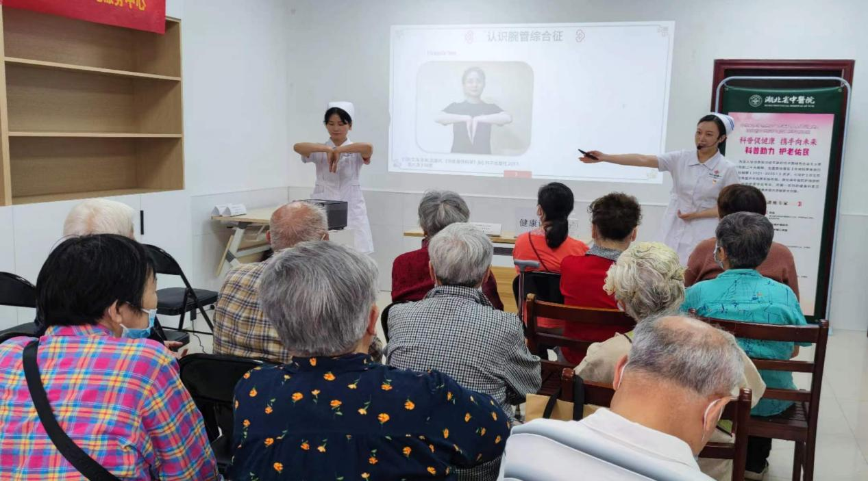 科普區(qū),老年護(hù)理專家、護(hù)理部科護(hù)士長(zhǎng)程瑤為社區(qū)老年人講授了《理筋護(hù)腕三步曲》,宣傳了腕管綜合征的相關(guān)保健知識(shí),教會(huì)了他們?nèi)绾晤A(yù)防“鼠標(biāo)手”。老年病科胡雅蘭護(hù)士長(zhǎng)就老年胸痛展開了具體又生動(dòng)的科普演講,教會(huì)了老年人如何識(shí)別三種急危胸痛疾病及居家處置流程,進(jìn)一步提升了老年人自我急救意識(shí)。