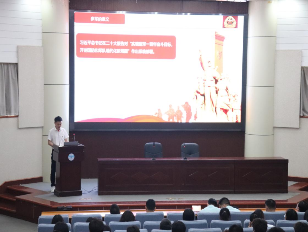 會議詳細介紹了大學生入伍的基本條件、報名參軍的基本流程以及大學生入伍優(yōu)待政策,對大學生參軍入伍的政治榮譽、學業(yè)保障、經(jīng)濟補貼、就業(yè)創(chuàng)業(yè)、部隊發(fā)展、考公考編等方面進行重點解讀,讓同學們對國家、省、市、學校的優(yōu)惠政策熟知于心,鼓勵廣大青年積極參軍入伍,報效國家。