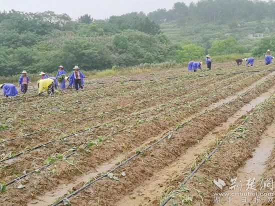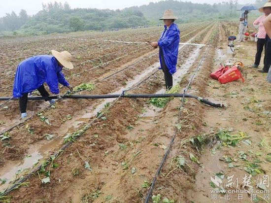 荊楚網(wǎng)(湖北日報(bào)網(wǎng))訊(通訊員毛紅平)6月25日,天空下著蒙蒙細(xì)雨,紅安縣永佳河鎮(zhèn)沙河村帥家河塆河畈地1000畝連片基地上,150多位村民正穿著雨衣,飛快地?fù)屧约t苕苗。