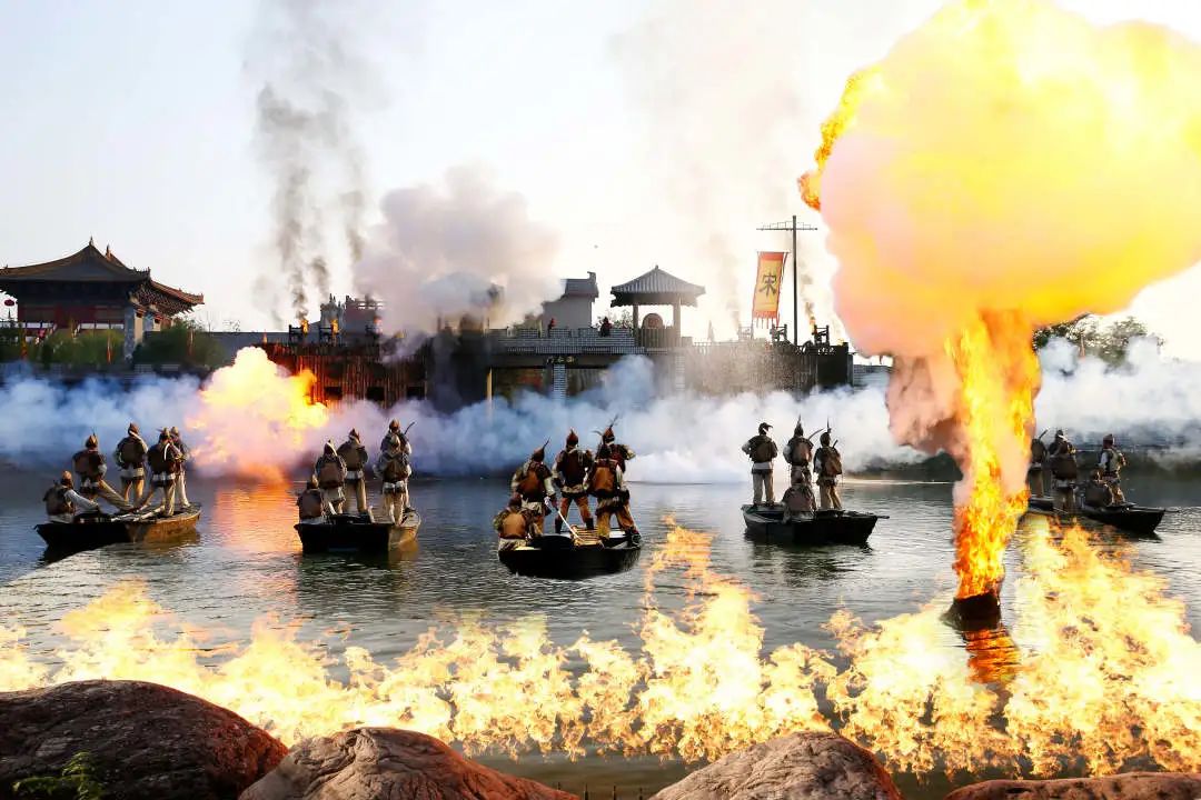 夜晚的清明上河園同樣精彩紛呈,數(shù)百萬盞花燈點亮了虹橋和汴河,展現(xiàn)出大宋不夜城的璀璨夜景。此外,大型水上實景演出《大宋·東京夢華》每晚上演,為游客們呈現(xiàn)了盛世畫卷。