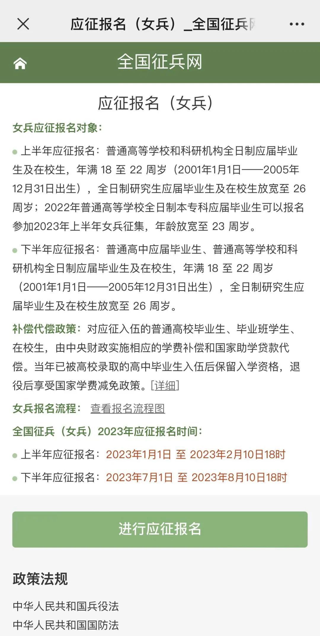 根據(jù)征集要求,2023年女兵下半年應征報名對象為:普通高中應屆畢業(yè)生、普通高等學校和科研機構全日制應屆畢業(yè)生及在校生,年滿18至22周歲(2001年1月1日-2005年12月31日出生);全日制研究生應屆畢業(yè)生及在校生放寬至26周歲。