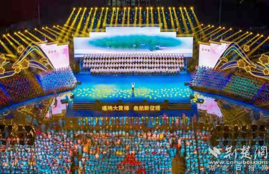 本屆黃梅戲藝術(shù)節(jié)的另一大特色是設(shè)立分會(huì)場(chǎng)。黃梅縣是千年古縣,更是黃梅戲藝術(shù)的發(fā)源地,本屆黃梅戲藝術(shù)節(jié)特別設(shè)置了黃梅縣分會(huì)場(chǎng)“唱響大黃梅”——一曲原創(chuàng)黃梅歌《靈潤(rùn)黃梅》奏響演出序章,黨群口、宣傳口、教育口、政府口、政法口、小池鎮(zhèn)、孔壟鎮(zhèn)、黃梅鎮(zhèn)和全國(guó)戲迷等11個(gè)黃梅戲演唱方陣身著彩裝競(jìng)唱黃梅戲經(jīng)典唱段,千余人齊唱《家在黃梅》,宏大的舞臺(tái),震撼的現(xiàn)場(chǎng),讓戲迷們著實(shí)過(guò)足了戲癮。