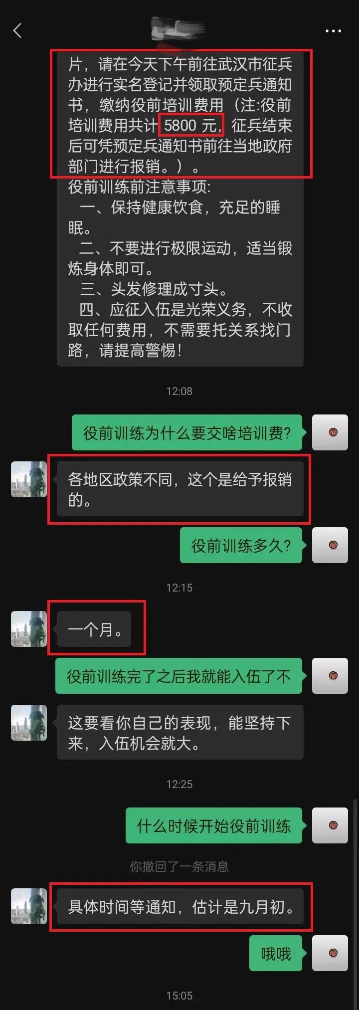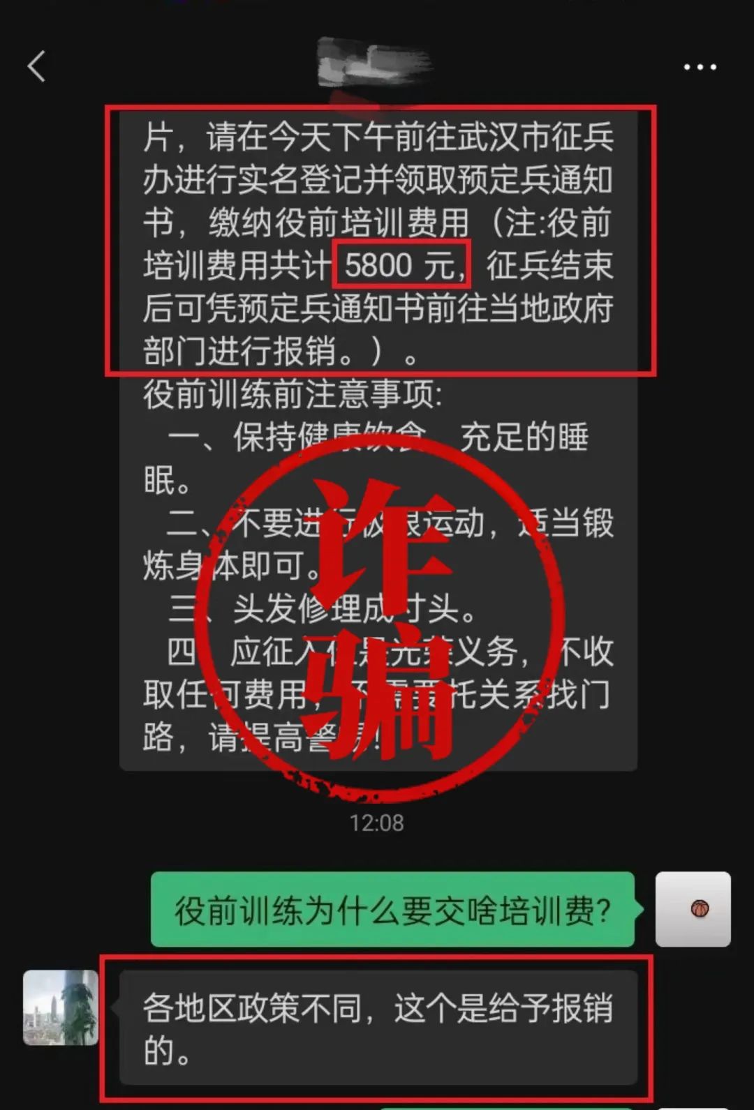 騙子聲稱“繳納役前培訓(xùn)費(fèi)用”,還說可憑預(yù)定兵通知書進(jìn)行報(bào)銷,甚至提醒應(yīng)征青年役前教育的相關(guān)注意事項(xiàng)。話術(shù)編造得看似完整,但是再三強(qiáng)調(diào)“參軍不花一分錢”,役前教育怎么可能需要繳費(fèi)呢?