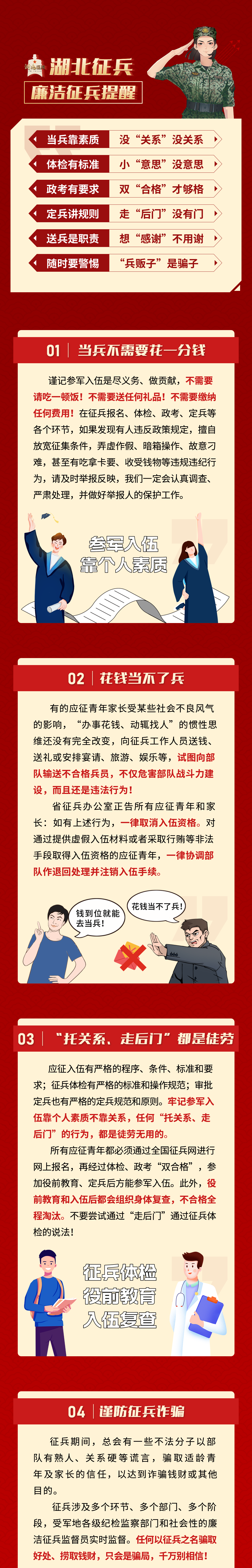 所有應(yīng)征青年和家長(zhǎng)都要記住,參軍入伍不需要花一分錢,應(yīng)征報(bào)名、征兵體檢、政治考核、役前教育等每一個(gè)參軍入伍的流程都不需要繳納任何費(fèi)用。兵役機(jī)關(guān)工作人員不會(huì)以任何名義向應(yīng)征青年或家長(zhǎng)收取任何費(fèi)用!任何以征兵之名騙取好處或者撈取錢財(cái)?shù)亩际球_局,不要相信!如果在應(yīng)征入伍的過程中,遇到有人以征兵之名索要錢財(cái),可以撥打各地征兵辦咨詢舉報(bào)電話進(jìn)行反映,并提供相關(guān)線索,我們一定會(huì)認(rèn)真調(diào)查、嚴(yán)肅處理,并做好舉報(bào)人的保護(hù)工作。