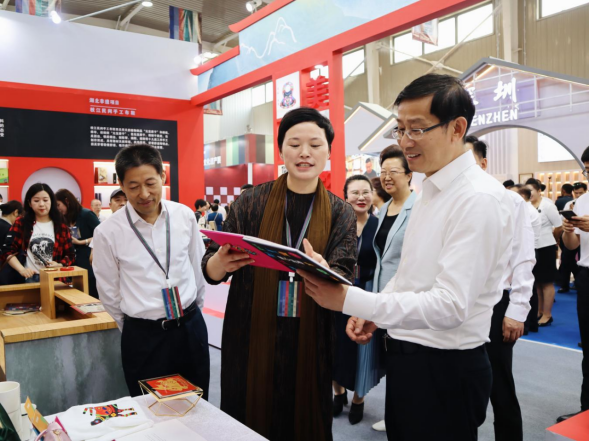 文化和旅游部黨組成員、副部長(zhǎng)饒權(quán),新疆維吾爾自治區(qū)黨委黨的建設(shè)工作領(lǐng)導(dǎo)小組副組長(zhǎng)田文等領(lǐng)導(dǎo)參觀了湖北展區(qū),并與傳承人進(jìn)行親切交流,了解傳承發(fā)展情況。