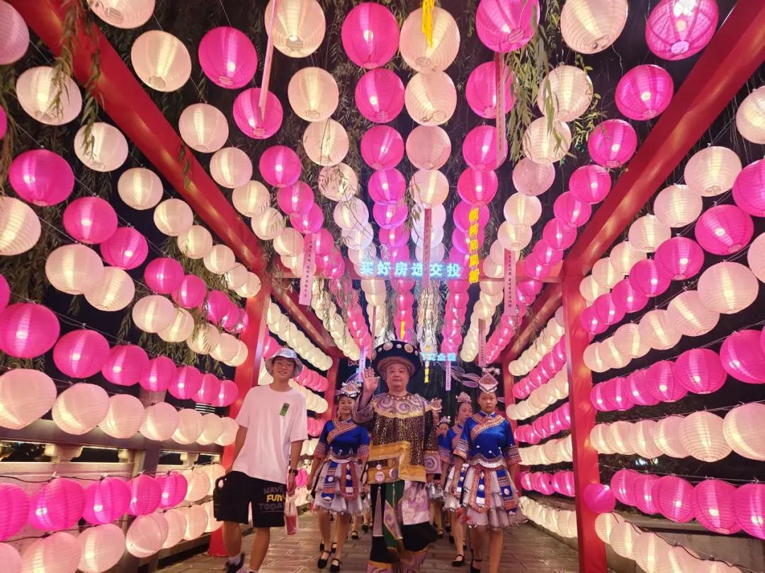 “姑娘們,阿爹帶你們?nèi)ペs場相親,要不要得?”將游客引入傳統(tǒng)土家“趕場相親”情境中,還原舊時女兒會“趕場相親”的場景,土司老爺帶著30余名幺妹兒穿梭在“土”味情話燈展長廊中,“額阿尼阿次”等土家語情話躍然進入視野,體現(xiàn)了恩施土家族文化的浪漫。