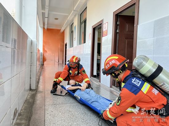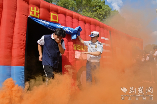 伴隨著陣陣緊促的警笛聲在校園響起,一教室內(nèi)“電線短路”,引燃桌面書籍,頓時濃煙滾滾。“請各位同學不要驚慌,捂住口鼻、低頭彎腰、貼墻往樓下有效進行疏散......”廣播中傳來疏散指令,消防員指導全體師生從“安全出口”有序迅速撤離,通過體驗“生命通道”,使師生掌握火場疏散逃生技能。