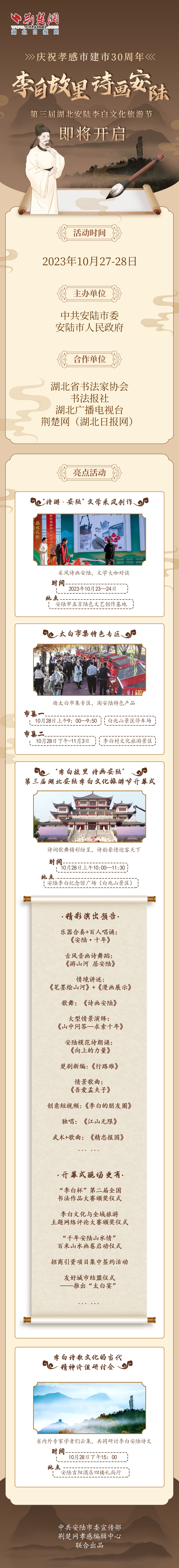 荊楚網(wǎng)(湖北日報網(wǎng))訊(記者黃菲 通訊員劉壯)又是一年銀杏黃,涢城處處飄墨香?!袄畎坠世?,詩畫安陸”——慶祝孝感市建市30周年暨第三屆湖北安陸李白文化旅游節(jié)將于10月28日盛大開幕。本屆李白文化旅游節(jié)有哪些精彩亮點呢?一起來看看!