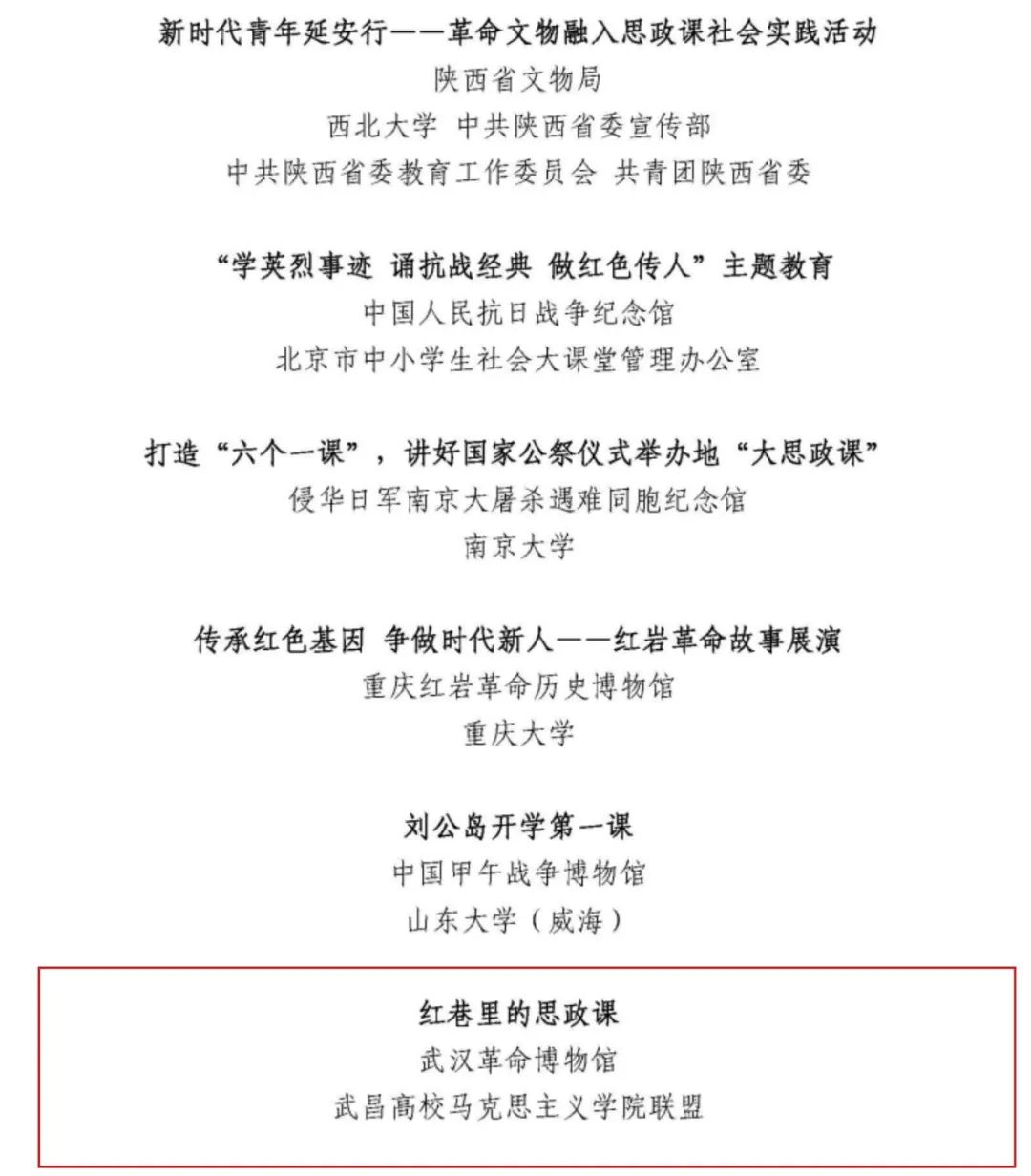 此外,湖北省還有五個(gè)項(xiàng)目入選以革命文物為主題的“大思政課”優(yōu)質(zhì)資源精品項(xiàng)目名單(100 項(xiàng))。