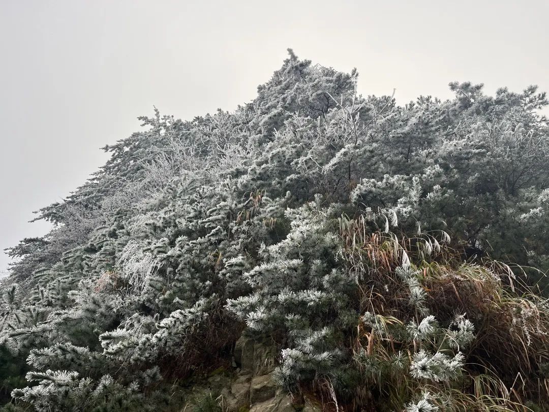 一排排樹冠凝霜掛雪,戴玉披銀,晶瑩剔透。此時的龜峰山美輪美奐,松針與灌木都裹上了一層潔白的玉衣,成為銀花盛開的玉樹。有的霧凇偏向枝椏一邊,銳利如同刀鋒;有的纏繞點綴,溫和如同棉絮;有的則無拘無束,肆意覆蓋巧石枯木。