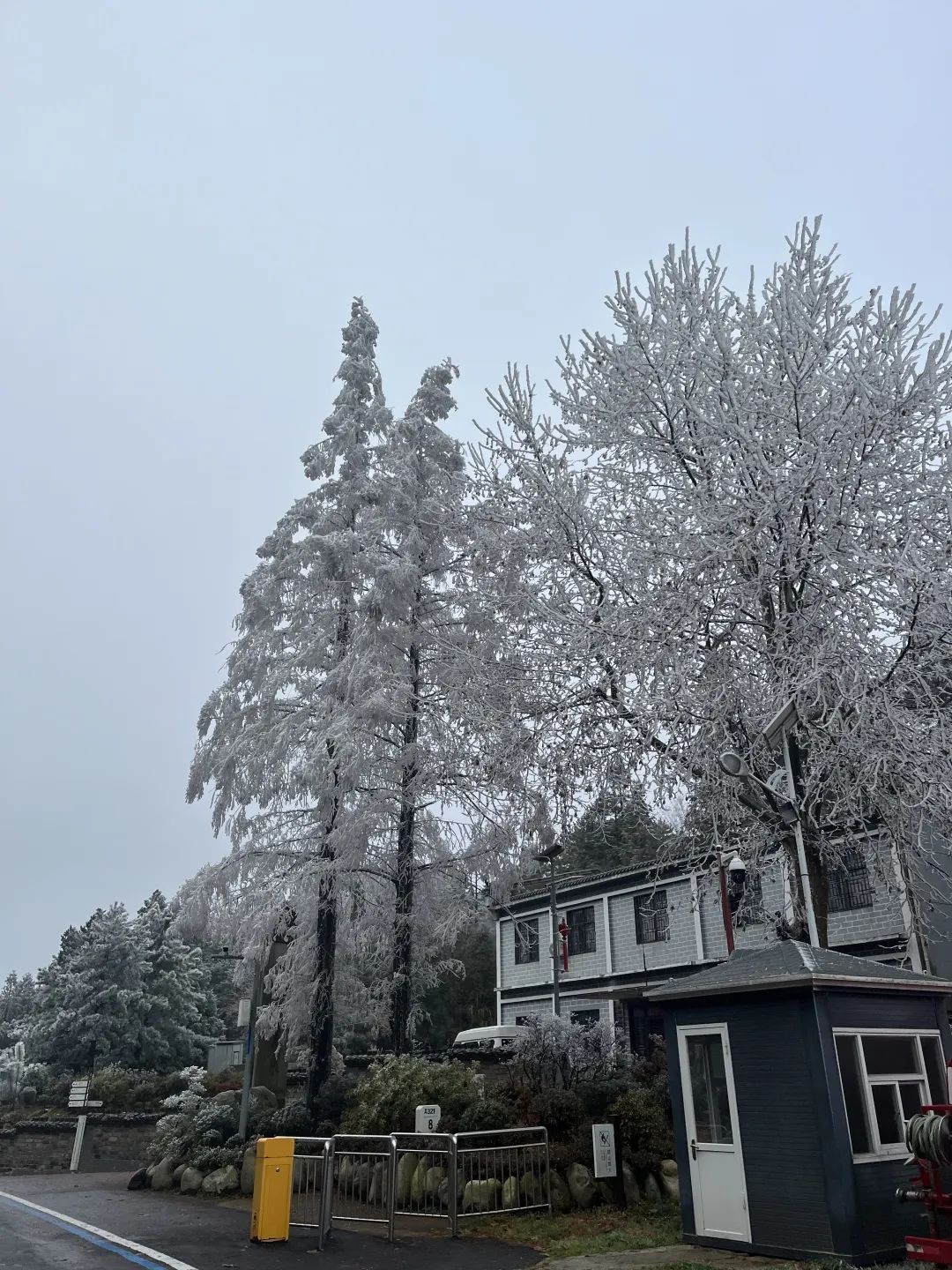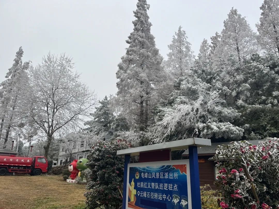 霧凇過后,山上的樹木、奇峰、神龜,皆被晶瑩剔透的霧凇包裹住。一夜之間銀裝素裹,山巒重疊顯得格外的妖嬈。