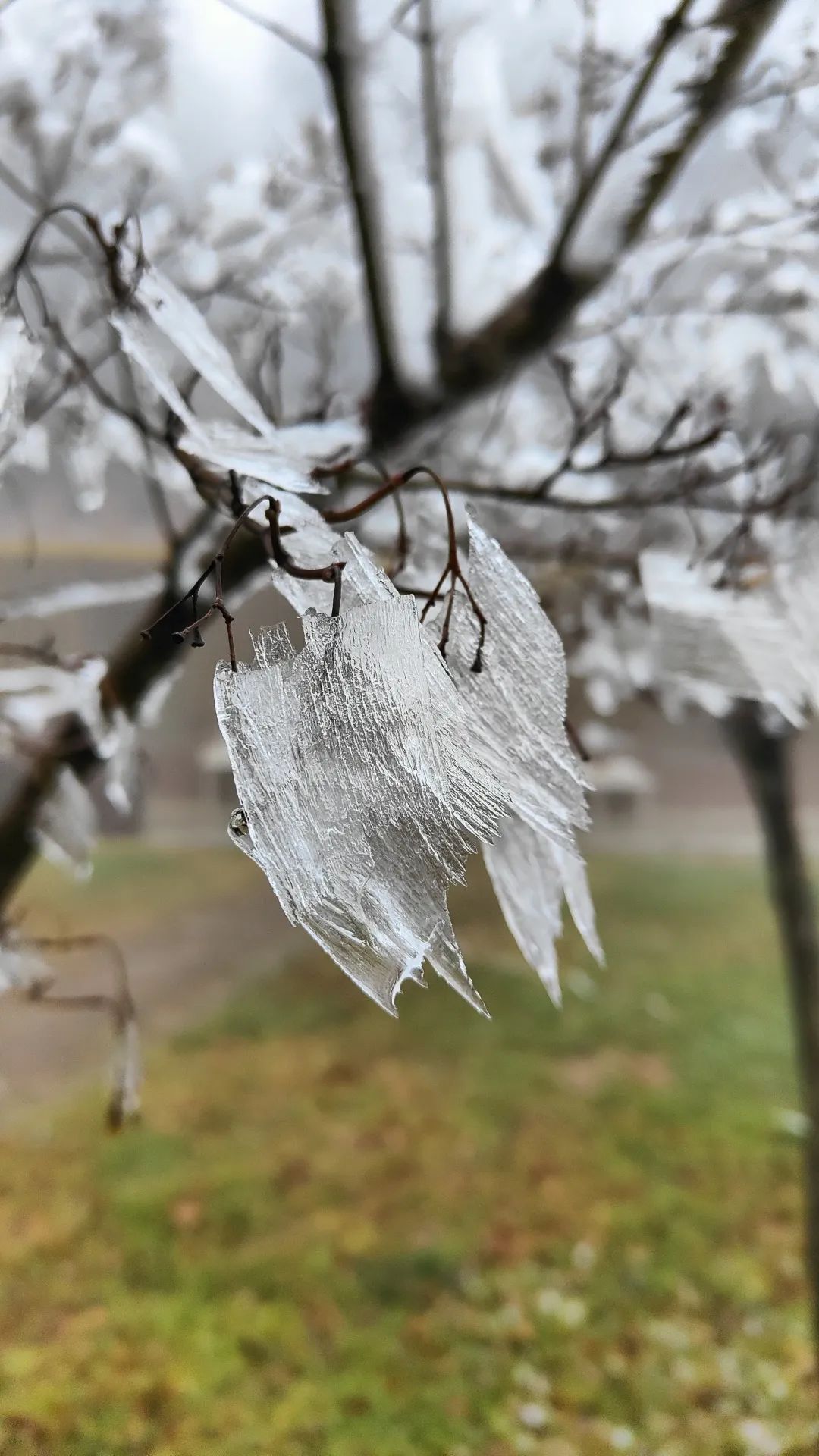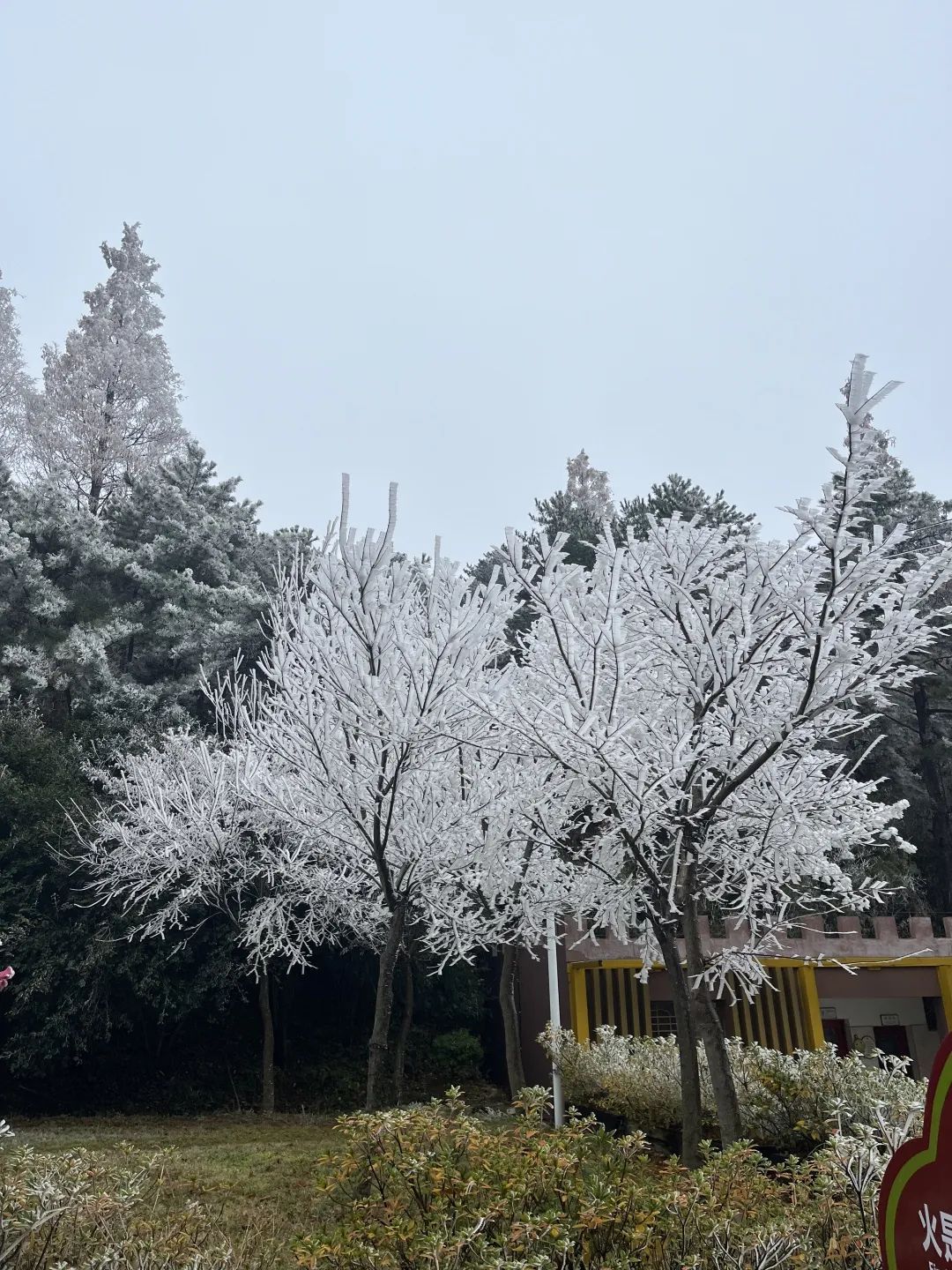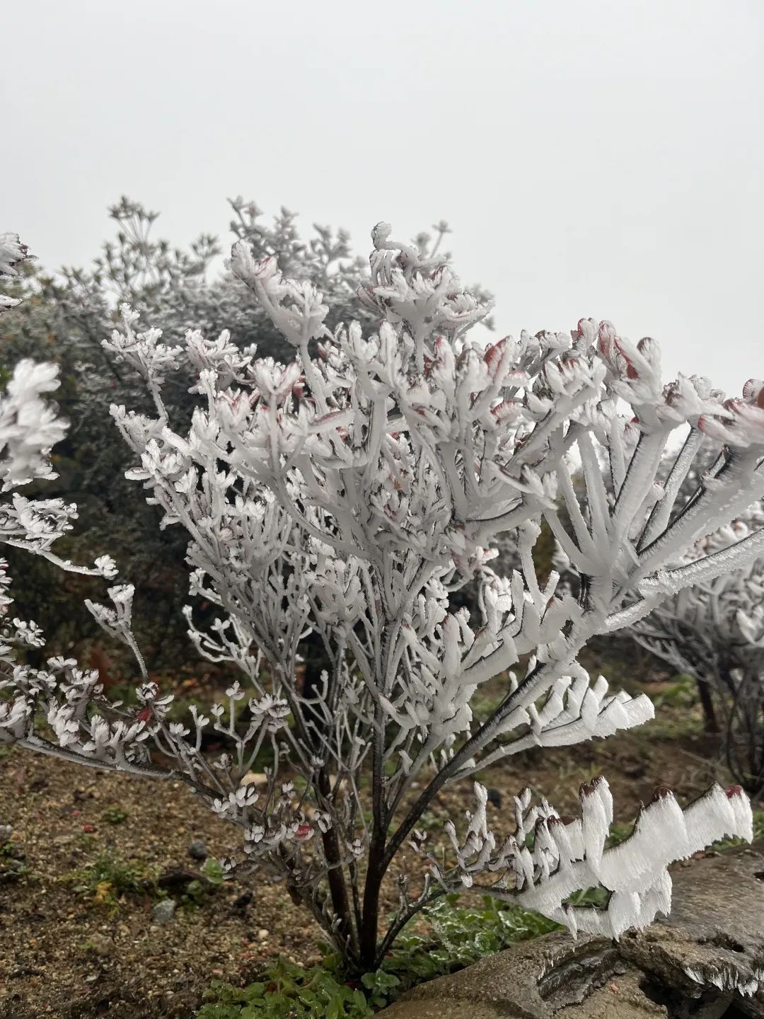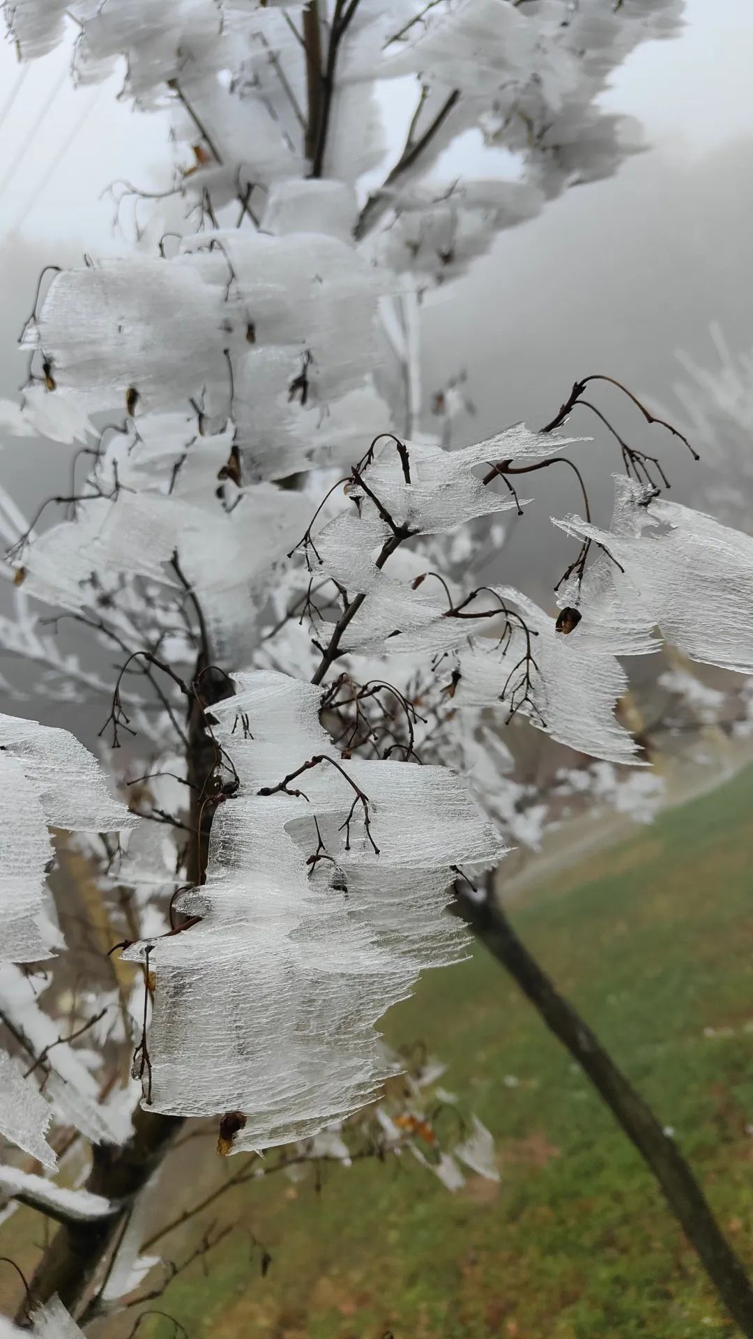 那些不透明的冰晶簇擁在一起,一層疊一層,一團接著一團,被霧凇包裹的草木一枝挨著一枝,一簇連著簇,就像無數(shù)潔白的花朵開在山間,極其壯觀。