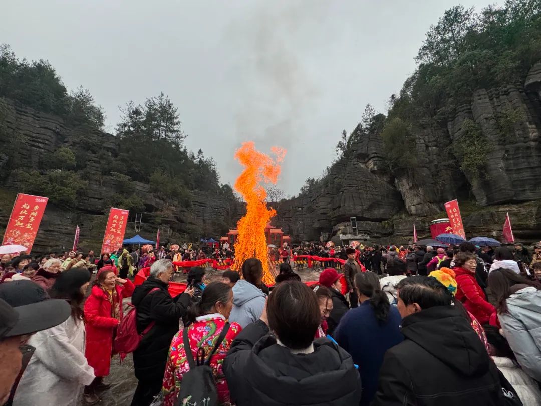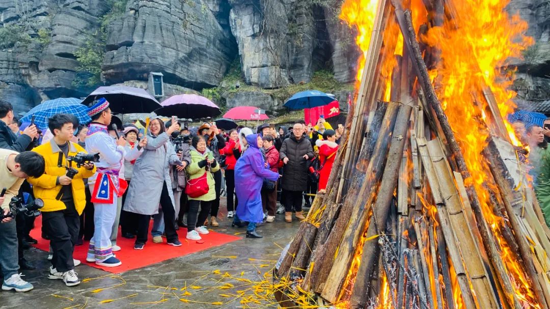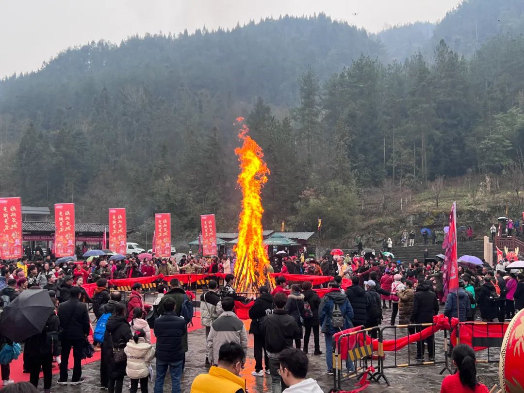 土家梯瑪(祭司)點(diǎn)燃了篝火,發(fā)放金穗,祈愿來年風(fēng)調(diào)雨順、年年有余。這熊熊篝火象征著新年的希望,現(xiàn)場的游客和村寨民眾一起感受著神秘的土家文化和年俗,共同祈福,共享民族大融合。