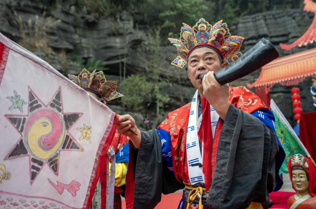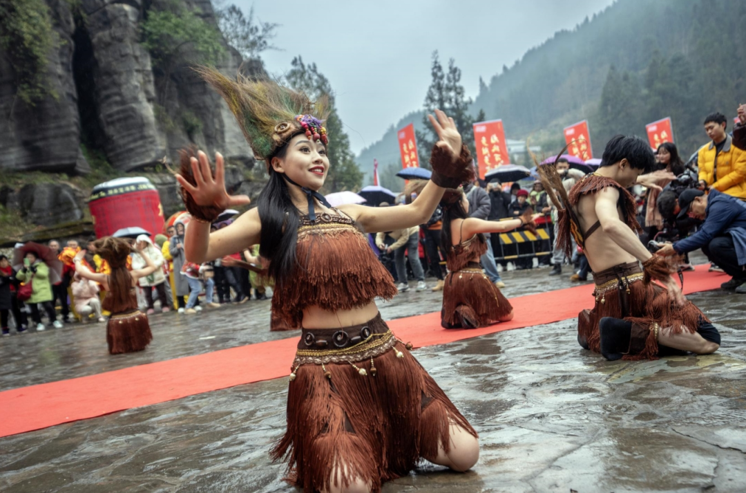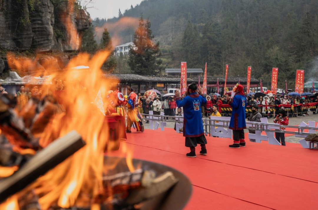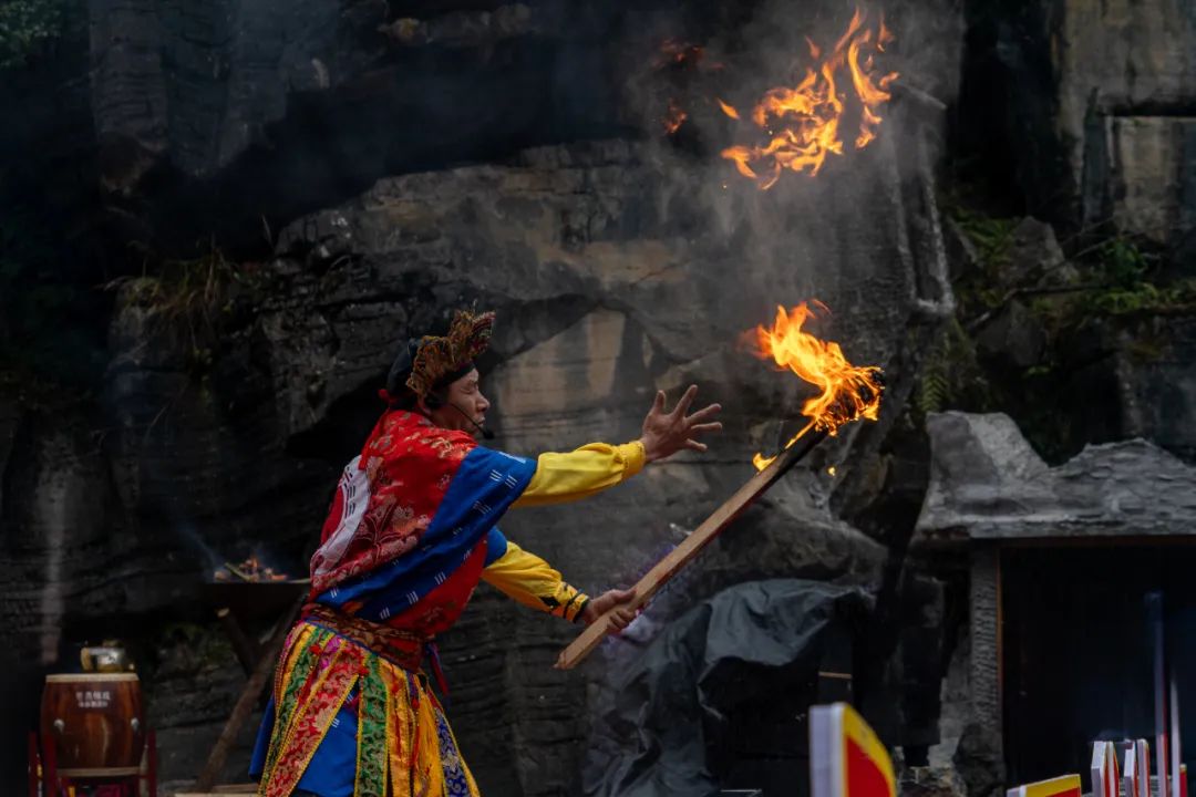 廟會(huì)的開寨祈福儀式是開幕式的焦點(diǎn),分為土鼓苗歌迎賓、土家非遺儺戲和茅古斯祈福等環(huán)節(jié),展現(xiàn)了豐富的民俗表演?,F(xiàn)場游客應(yīng)接不暇,陶醉在劇情沉浸式的演出中。
