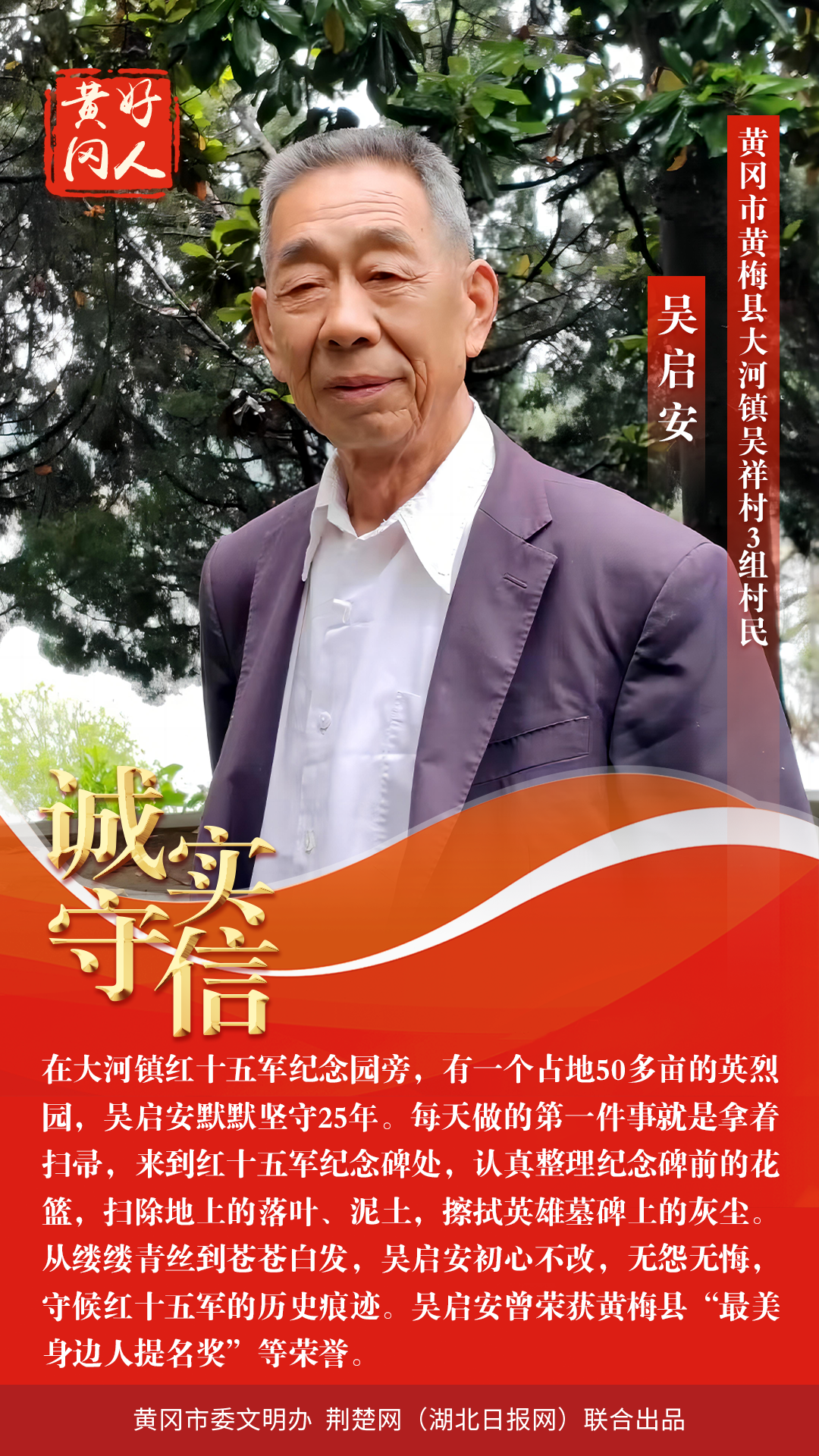 本期“黃岡好人”共有5組好人入選。他們中有“敬業(yè)奉獻(xiàn),扎根商海40余載”的樊漢明;有“默默堅(jiān)守25年,義務(wù)管理紅十五軍紀(jì)念園”的吳啟安;有“孝老愛親,被譽(yù)為大山里‘好兒媳’”的王志珍;有“見義勇為,先后5次救起落水群眾”的王臘;有“誠實(shí)守信,熱心勸學(xué)建書屋”的畢紅平。