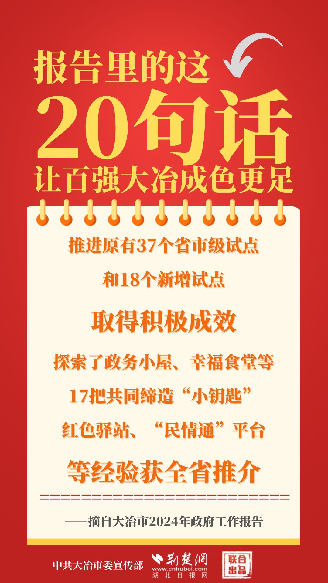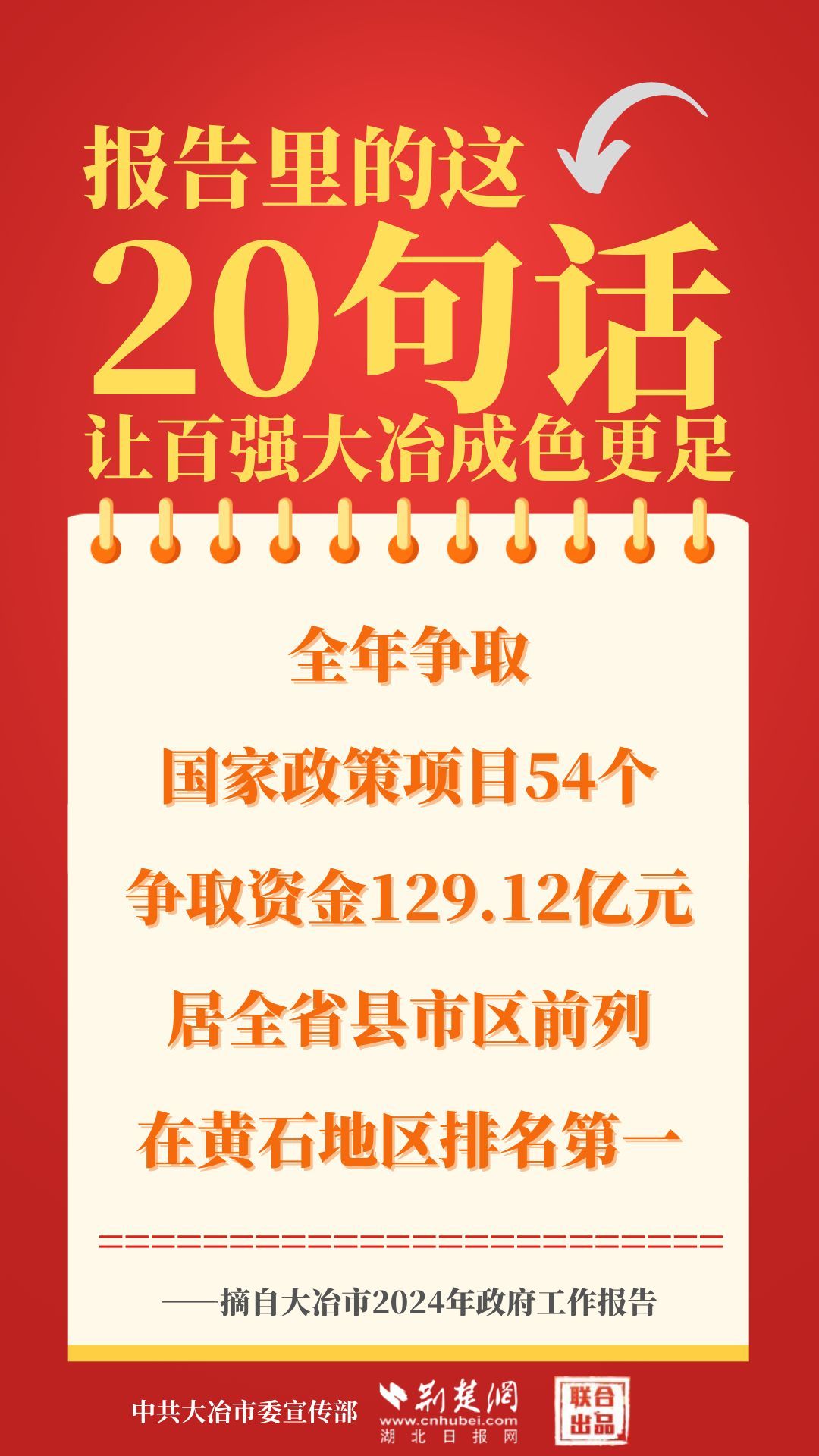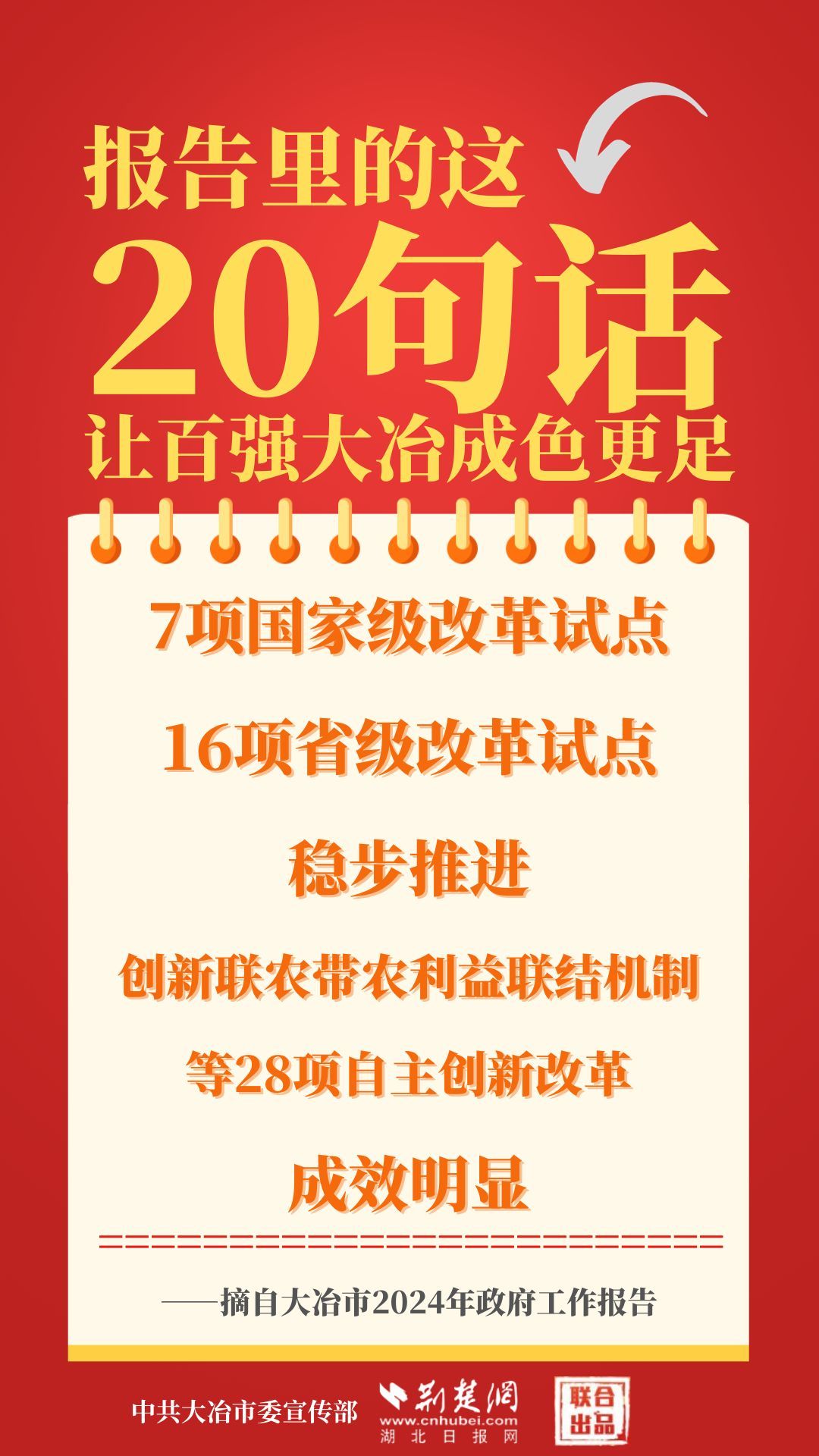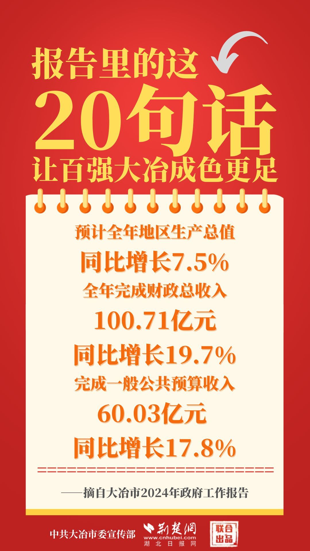 1月12日,大冶市第七屆人民代表大會(huì)第四次會(huì)議開(kāi)幕,大冶市委副書(shū)記、市長(zhǎng)孫輒作政府工作報(bào)告。報(bào)告里的這20句話(huà),讓百?gòu)?qiáng)大冶成色更足。