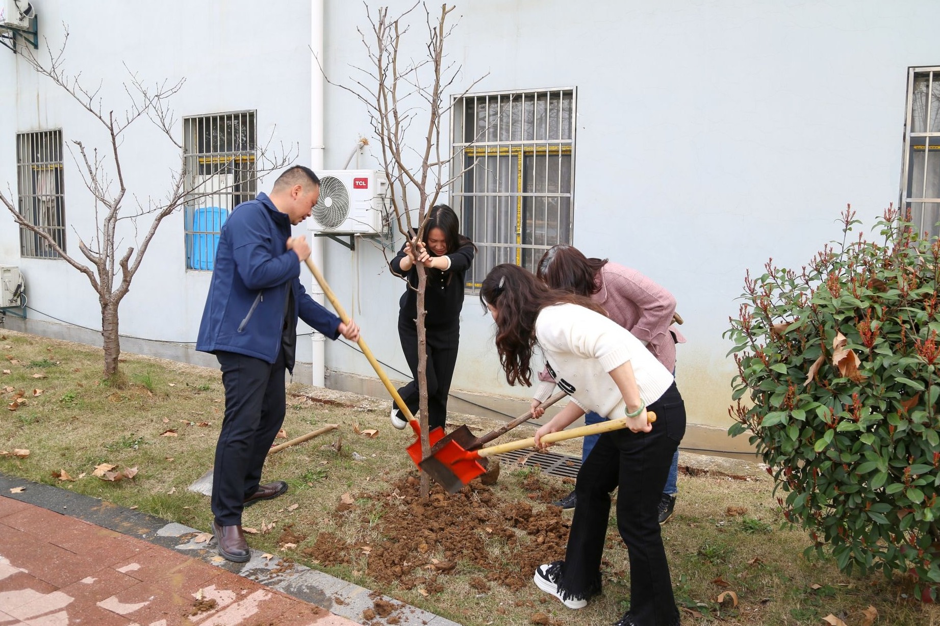 植樹(shù)地點(diǎn)選在單位后院花園,活動(dòng)規(guī)模不大,但現(xiàn)場(chǎng)氣氛很活躍。大家笑意盎然,揮鋤培新土,施肥育根基,澆水潤(rùn)新枝。經(jīng)過(guò)半小時(shí)的精心栽種,六棵樹(shù)苗傲然挺立在草坪上,為花園增添了一抹欣欣向榮的綠意。