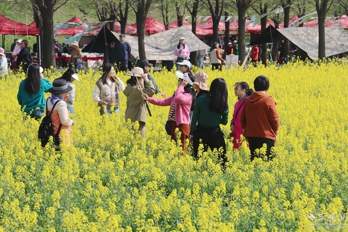 黃澄澄的油菜花田如金色海洋般廣袤無垠,春風(fēng)拂過,花浪起伏,散發(fā)出令人陶醉的清新香氣。游客們紛紛踏入這片花海,感受春天的氣息,品味鄉(xiāng)土的韻味。