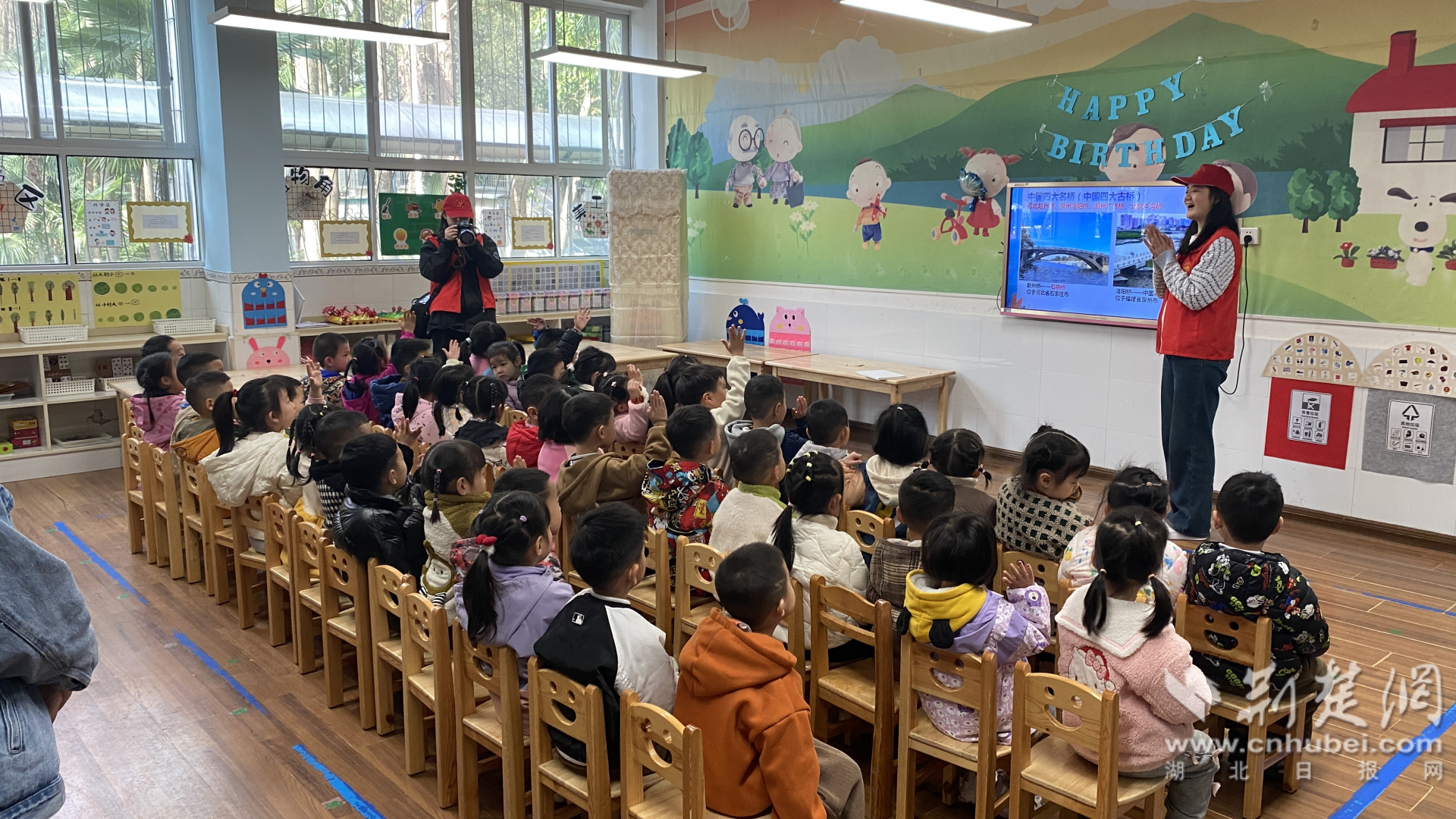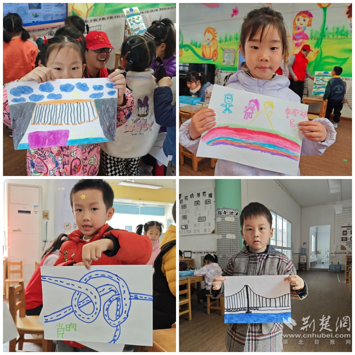 “一道長虹落江面,人來車往很方便;不怕風(fēng)吹和雨打,交通運(yùn)輸做貢獻(xiàn)。小朋友們請你們猜一猜,這說的是什么呀?”。伴隨著謎語游戲開場,小朋友們開始了一場愉快的橋梁探索之旅。“大姐姐”首先從中國古代四大名橋出發(fā),用通俗易懂的語言,給孩子們介紹了中國橋梁發(fā)展歷史和橋梁知識,在力與美的交融輝映下,小朋友對中國橋梁文化與偉大成就有了感性認(rèn)識。一張張精美的橋梁圖片,一串串有趣的小小問題,引得孩子們熱情高漲,爭先恐后舉手回答,現(xiàn)場氣氛十分熱烈。