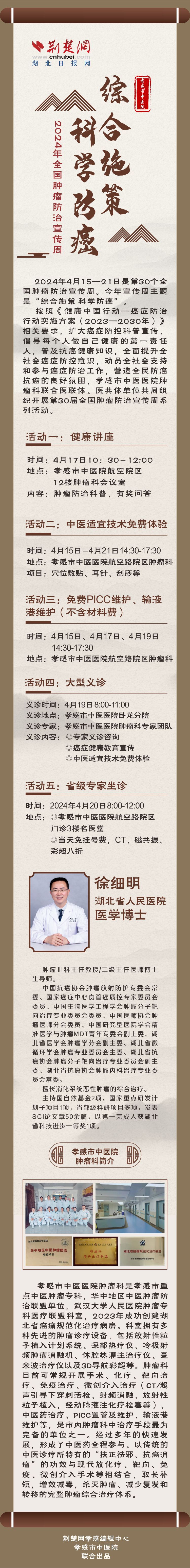 2024年4月15—21日是第30個全國腫瘤防治宣傳周,今年的主題是“綜合施策 科學防癌”。孝感市中醫(yī)院腫瘤防治宣傳周系列活動開啟,健康講座、大型義診、中醫(yī)適宜技術免費體驗、更有省級專家坐診,一起來了解一下吧!