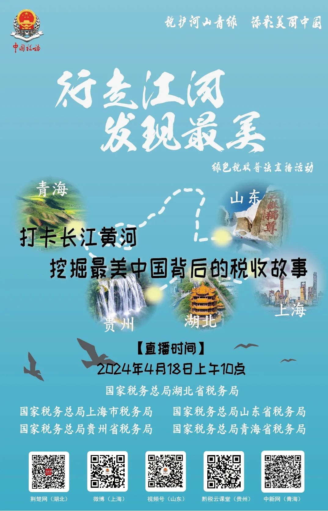 4月18日上午10 點(diǎn),湖北、上海、山東、貴州、青海五省市稅務(wù)部門聯(lián)合舉辦“行走江河 發(fā)現(xiàn)最美”綠色稅收普法直播活動(dòng)。歡迎收看!