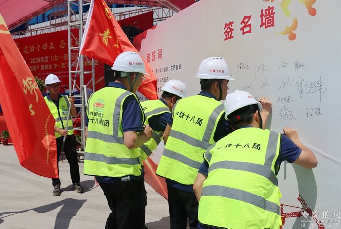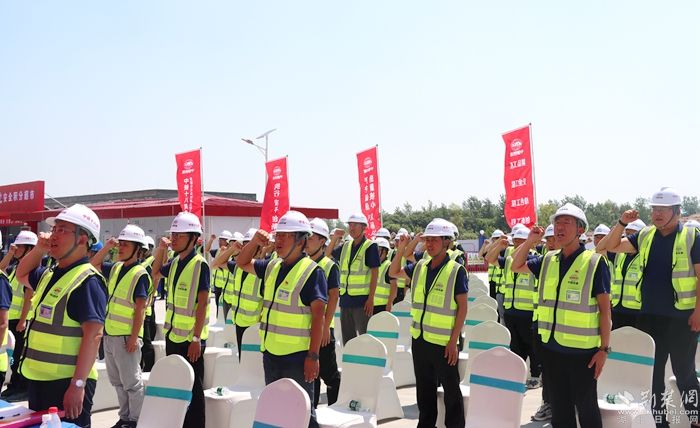 “我是一名光榮的建設(shè)者,面對(duì)鮮紅旗幟,莊嚴(yán)宣誓: 快速制勝,安全至上,只爭(zhēng)朝夕創(chuàng)高產(chǎn);精細(xì)管理 創(chuàng)譽(yù)創(chuàng)效,銳意進(jìn)取提質(zhì)效;勇當(dāng)標(biāo)桿,建造精品,實(shí)干興企爭(zhēng)一流。我鄭重承諾……堅(jiān)決做到……”建設(shè)者們的眼中閃爍著堅(jiān)定的光芒,現(xiàn)場(chǎng)的氣氛被這一番誓言推向了高潮。