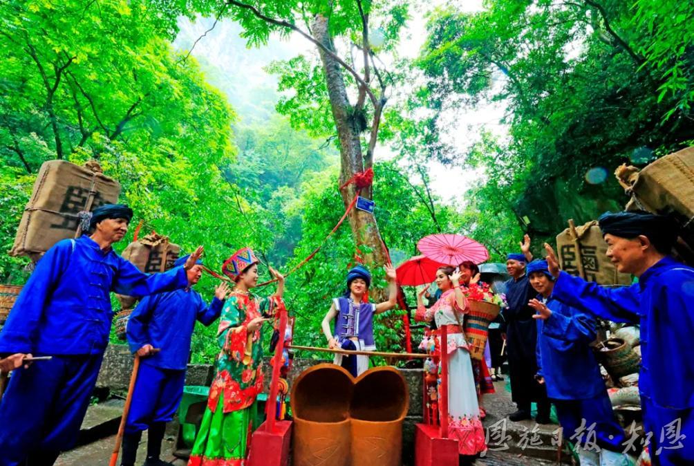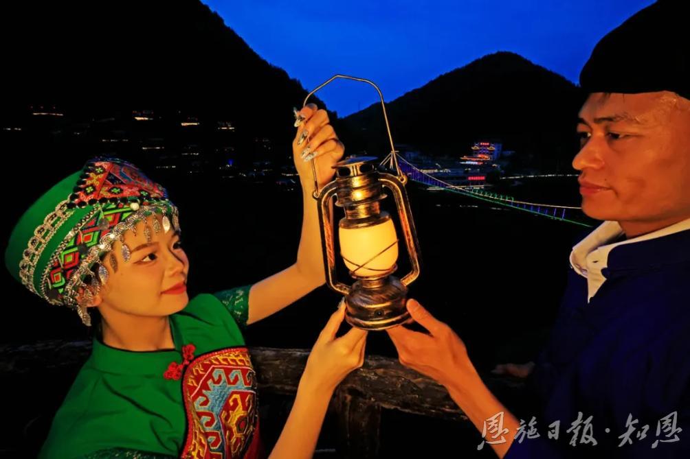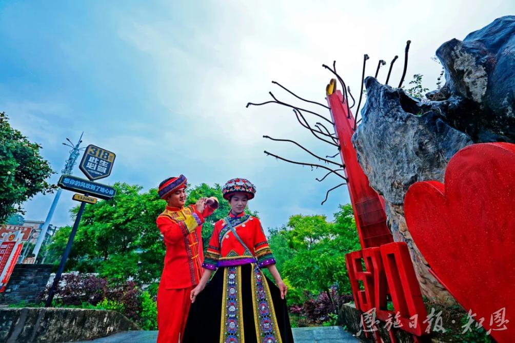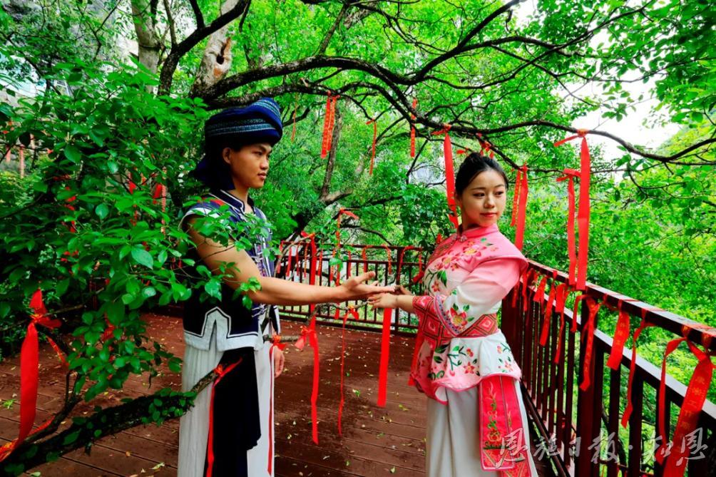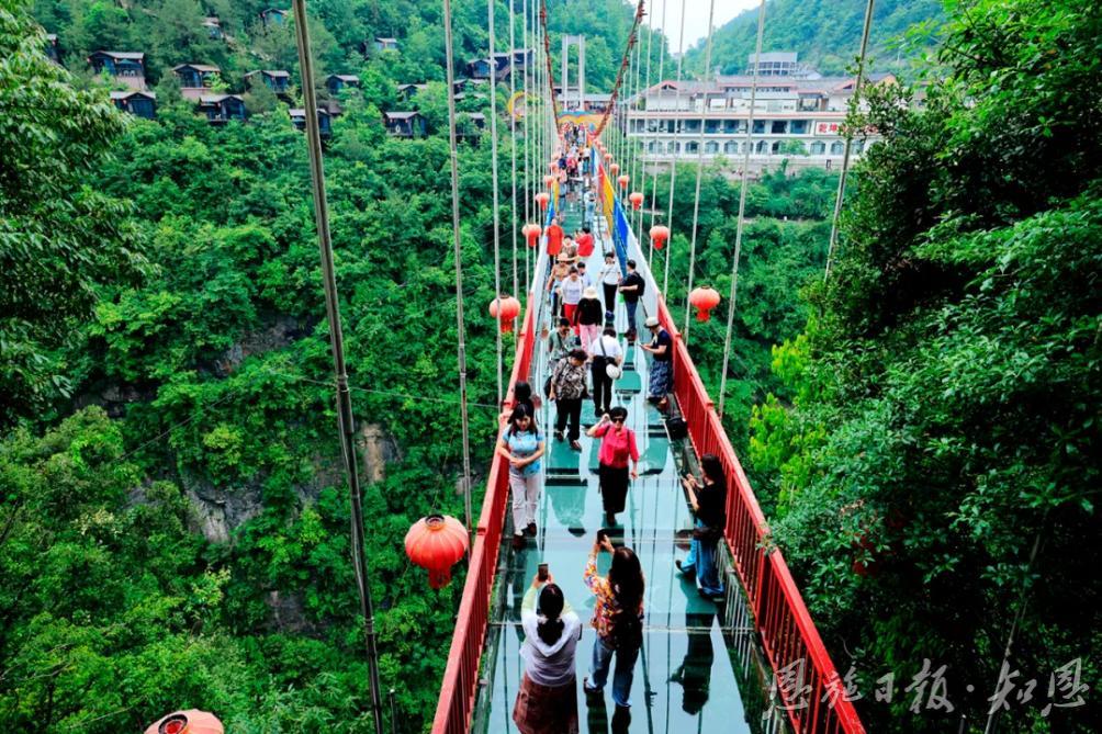 恩施地心谷,可以說是旅游業(yè)中的一個(gè)神奇地標(biāo)!這里有318國道1520里程碑,這里有滬渝高速1314公里里程碑,打卡地心谷,一路都有愛意相隨。當(dāng)“5·19”與“5·20”邂逅,使旅程變得格外生動(dòng)而有趣。在中國旅游日到來之際,天南海北的游客紛紛慕名而來,他們走過驚險(xiǎn)的懸空玻璃橋,漫步幽奇的懸崖棧道,打卡“地之心”,體驗(yàn)刺激的崖漂,聽喜花鼓這邊唱來那邊和……一步一喜,一步一樂。