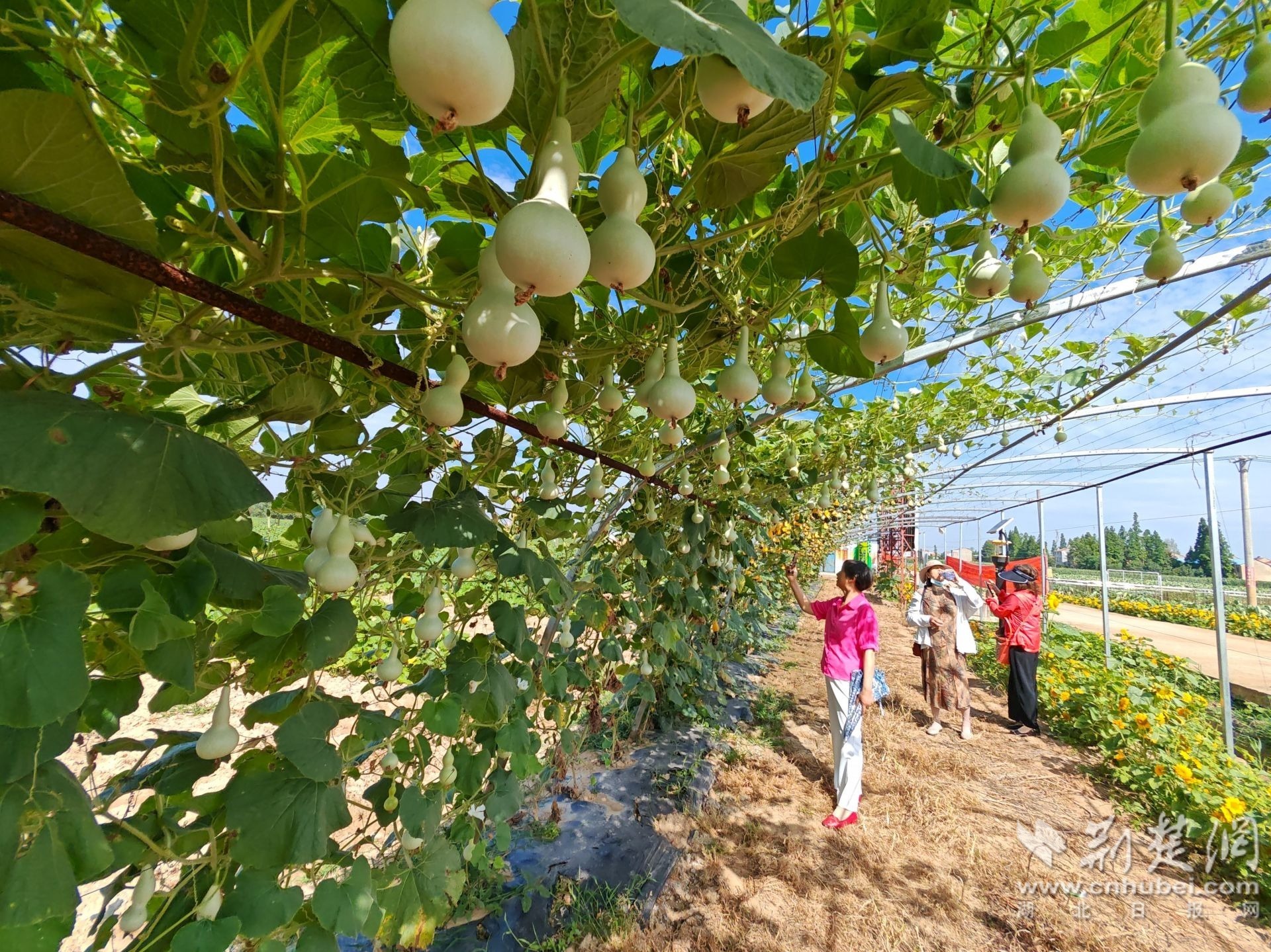 這些遠(yuǎn)道而來的客人,首先到四季長(zhǎng)青蔬菜種植專業(yè)合作社便民服務(wù)站觀看擺放的各種葫蘆、南瓜,到科普基地觀看奇果異瓜,到幼苗工廠觀看無土栽培,到田頭觀看連體架上生長(zhǎng)的“鴛鴦梨”“鶴首”“迷你葫蘆”,又到“每之文農(nóng)場(chǎng)”的荷花池邊觀賞荷花,有的還登上拖拉機(jī)駕駛室體驗(yàn)農(nóng)耕生活,還有的則到菜地采摘新鮮的茄子、莧菜、黃瓜等蔬菜。大家在稀奇古怪的葫蘆地、綠油油的菜地、整齊的甘蔗苗地以及漂亮的荷花池邊觀賞拍照,流連忘返。