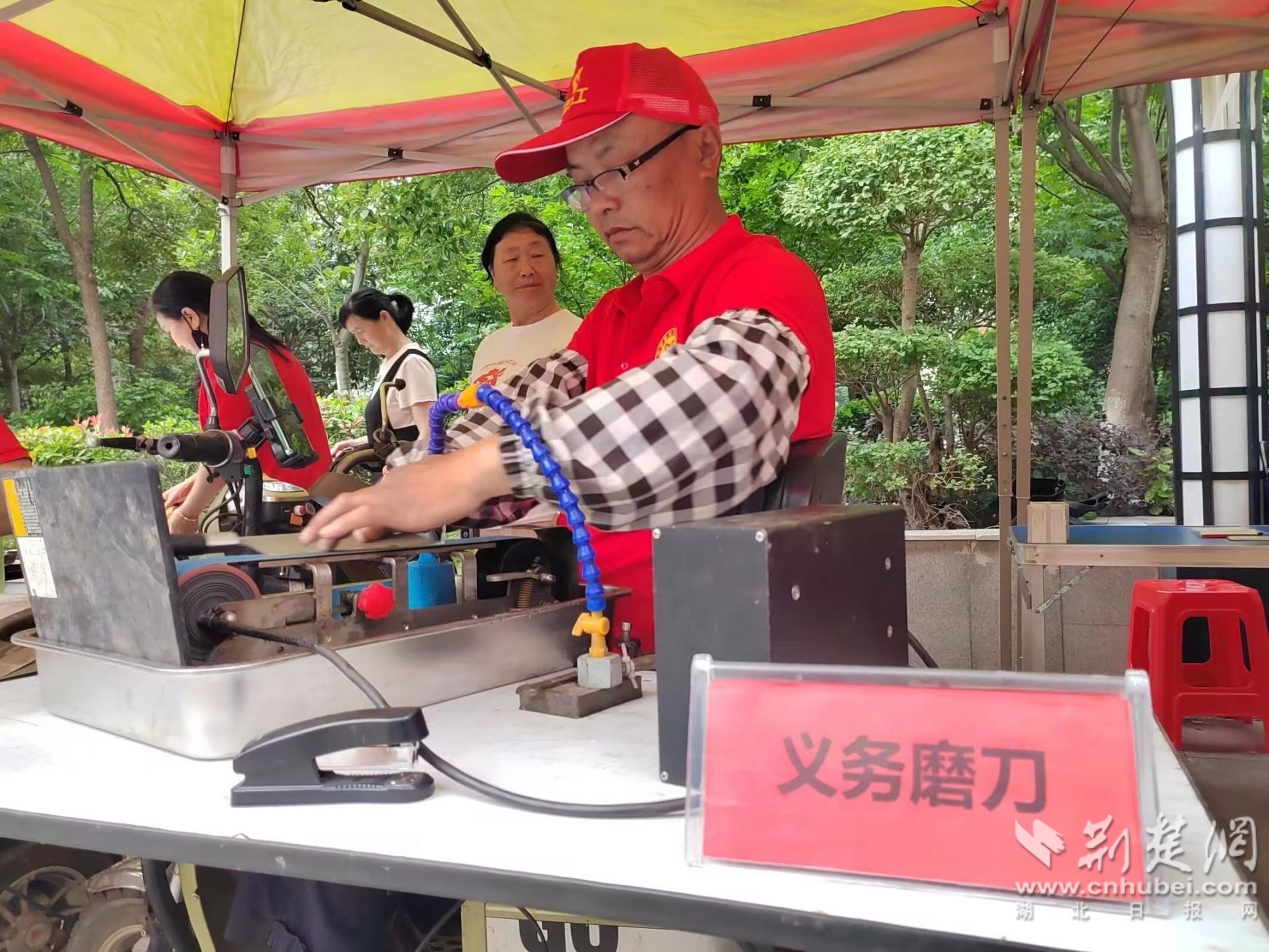 在一次志愿活動中,他所在的攤位前人滿為患,只見他接過刀具,先刀頭后刀尾,一壓一拉,灑水降溫,如此反復,動作干凈利落,原本銹鈍的刀具重新變得鋒利光亮。他嫻熟的技藝引來不少人圍觀,居民絡繹不絕,直至活動結(jié)束仍有人將家里的刀具送來打磨。