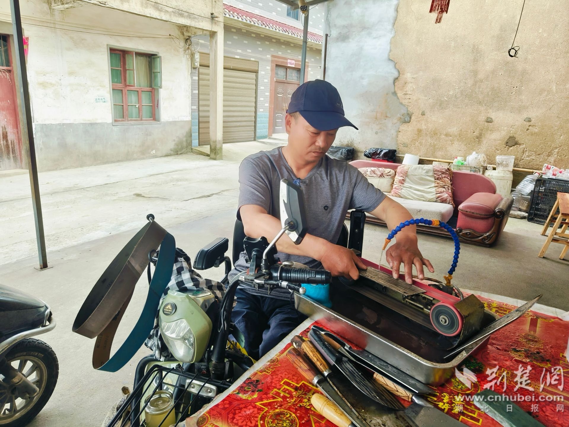 池漢橋在村民家中免費磨菜刀。