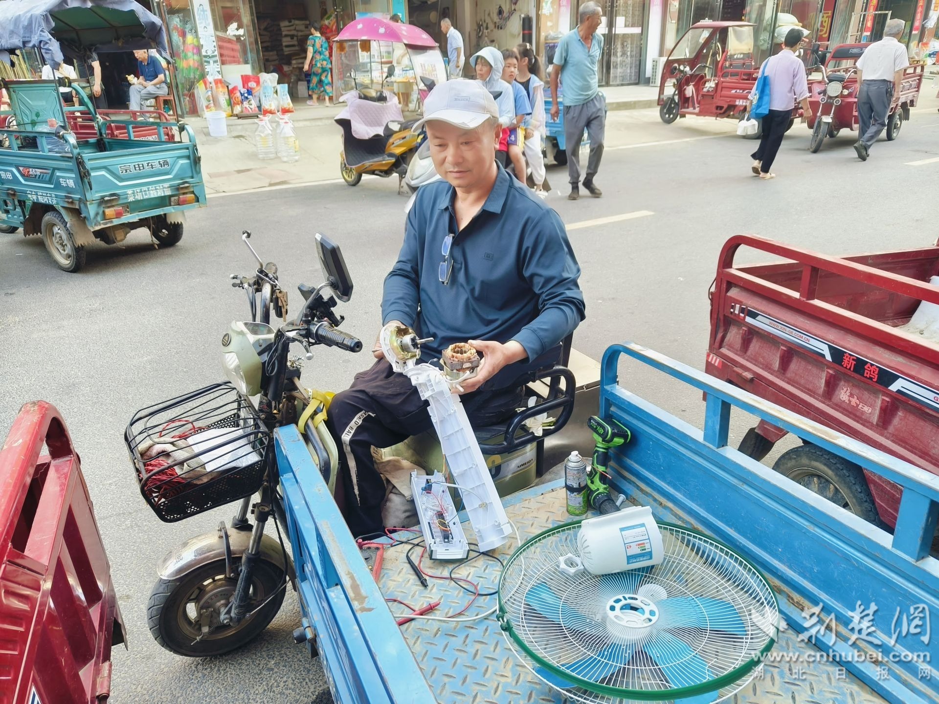 除維修家電外,池漢橋還加入孝感市義工聯(lián)合會,參加各類志愿服務活動,成為一名“輪椅志愿者”,給大家免費維修電風扇、電飯煲和磨菜刀等。因出行不太方便,為了不給他人增加麻煩,參加志愿活動時,他每次都早早騎車來到現(xiàn)場。