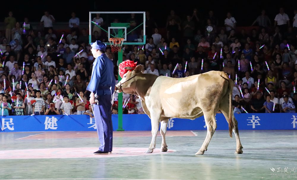 19時30分許,開幕式開始,聲聲震天的威風(fēng)鑼鼓、剛勁有力的武術(shù)表演、青春動感的健身舞蹈以及活力十足的歌曲串燒,一次次引來現(xiàn)場的歡呼喝彩。當(dāng)工作人員牽著“冠軍牛”進(jìn)入場地那一刻,現(xiàn)場的熱烈氛圍再次被引向高潮。